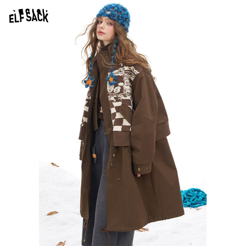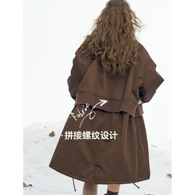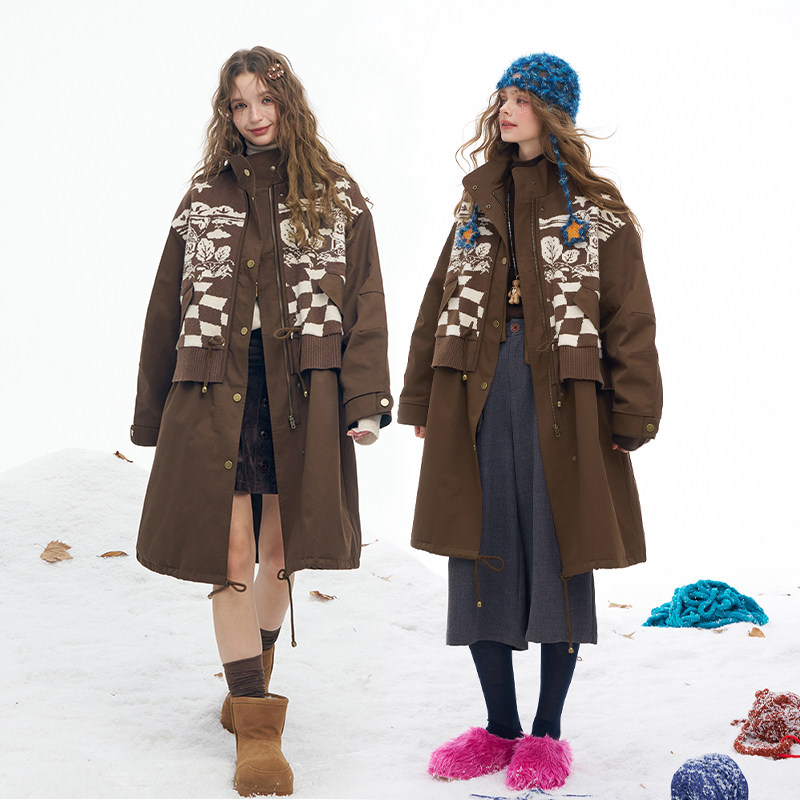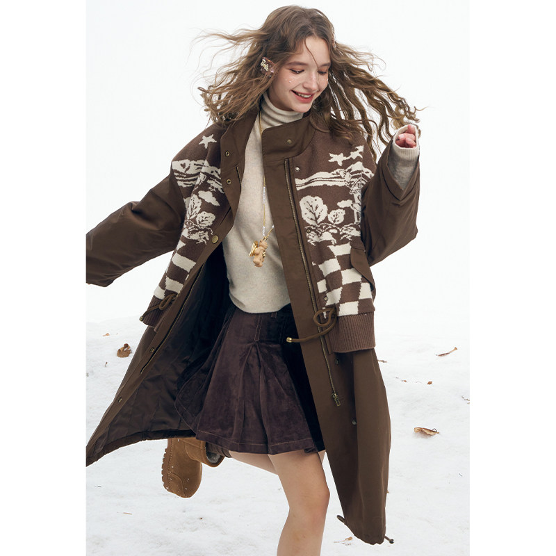 妖精的口袋毛织提花拼接长款棉衣女2026冬季新款保暖夹棉工装外套