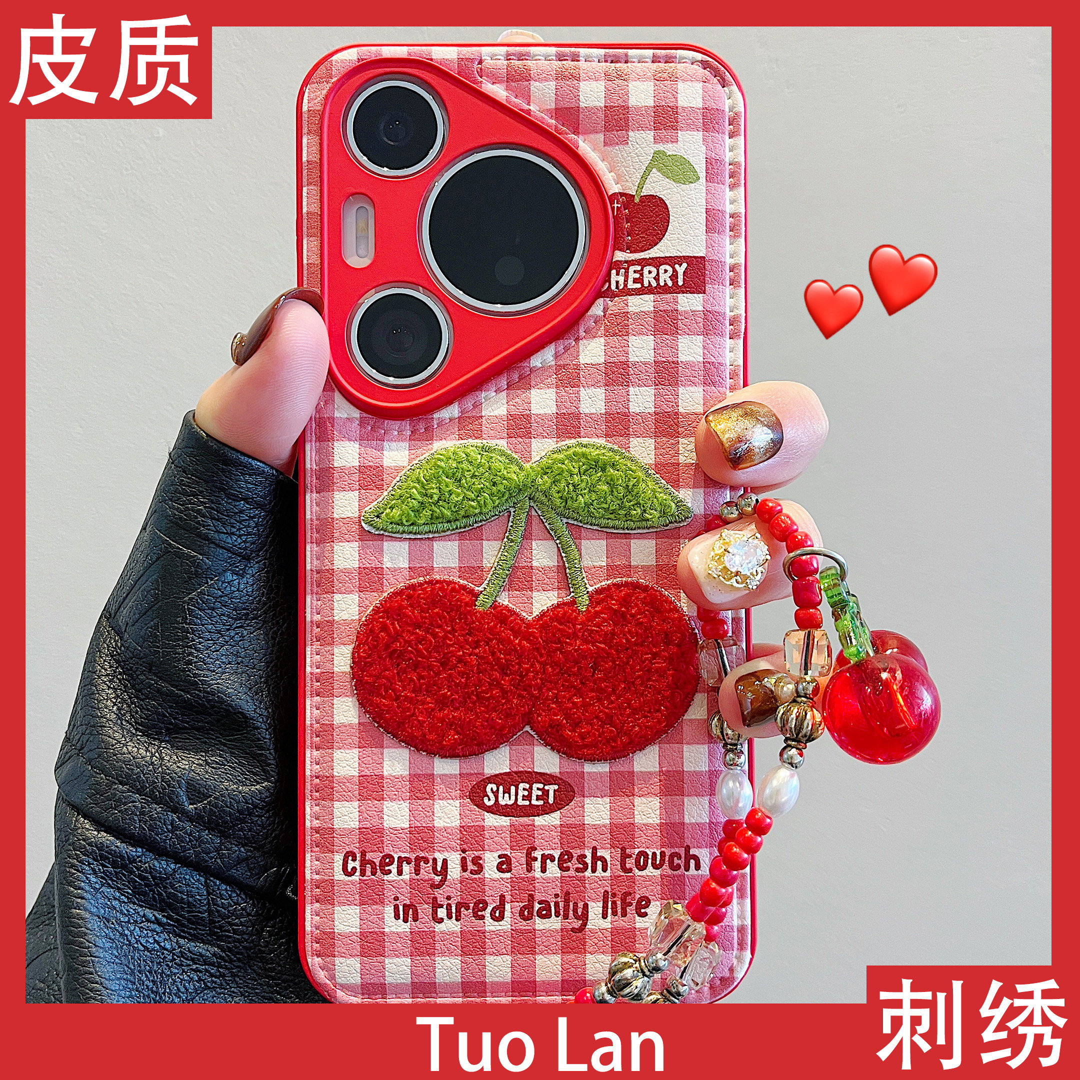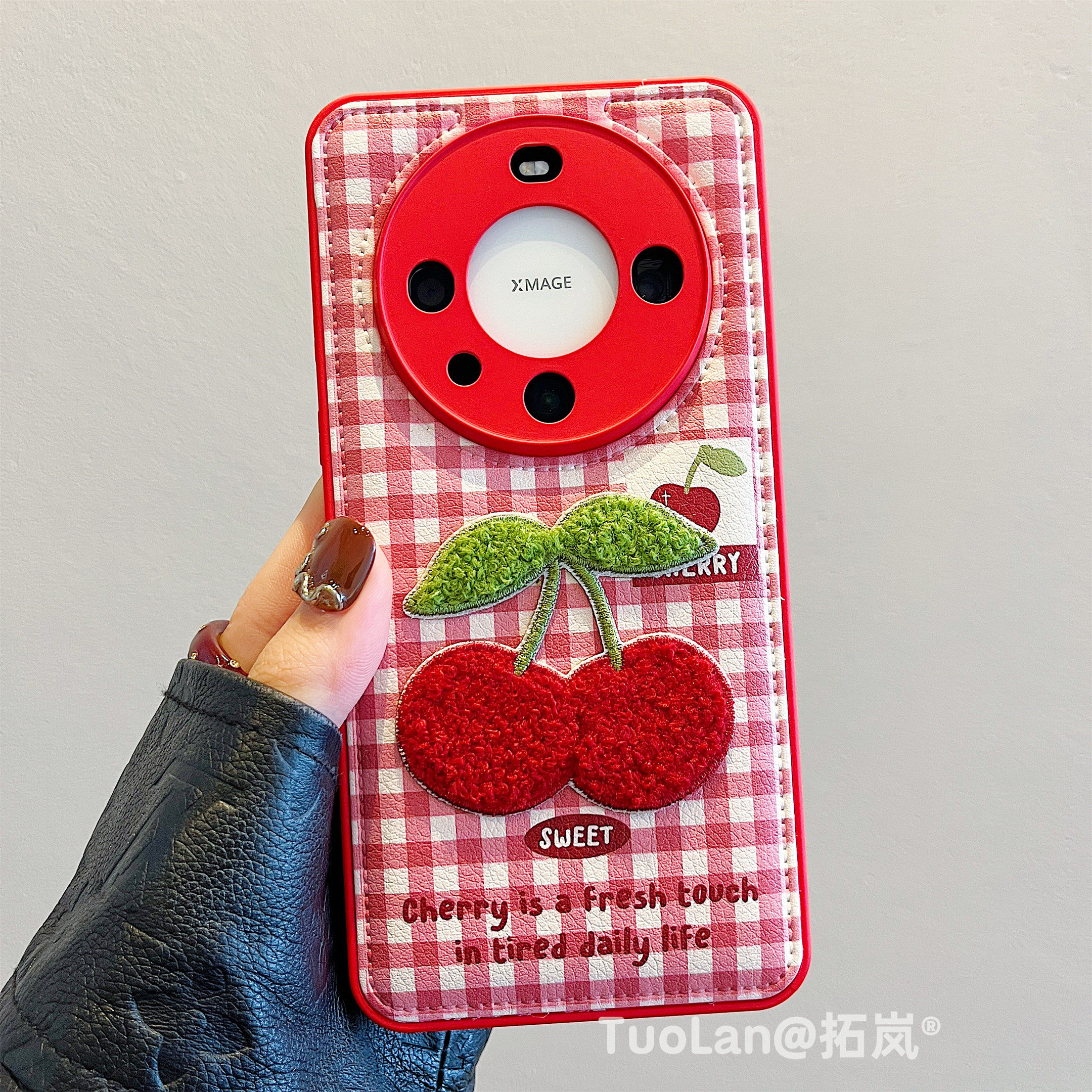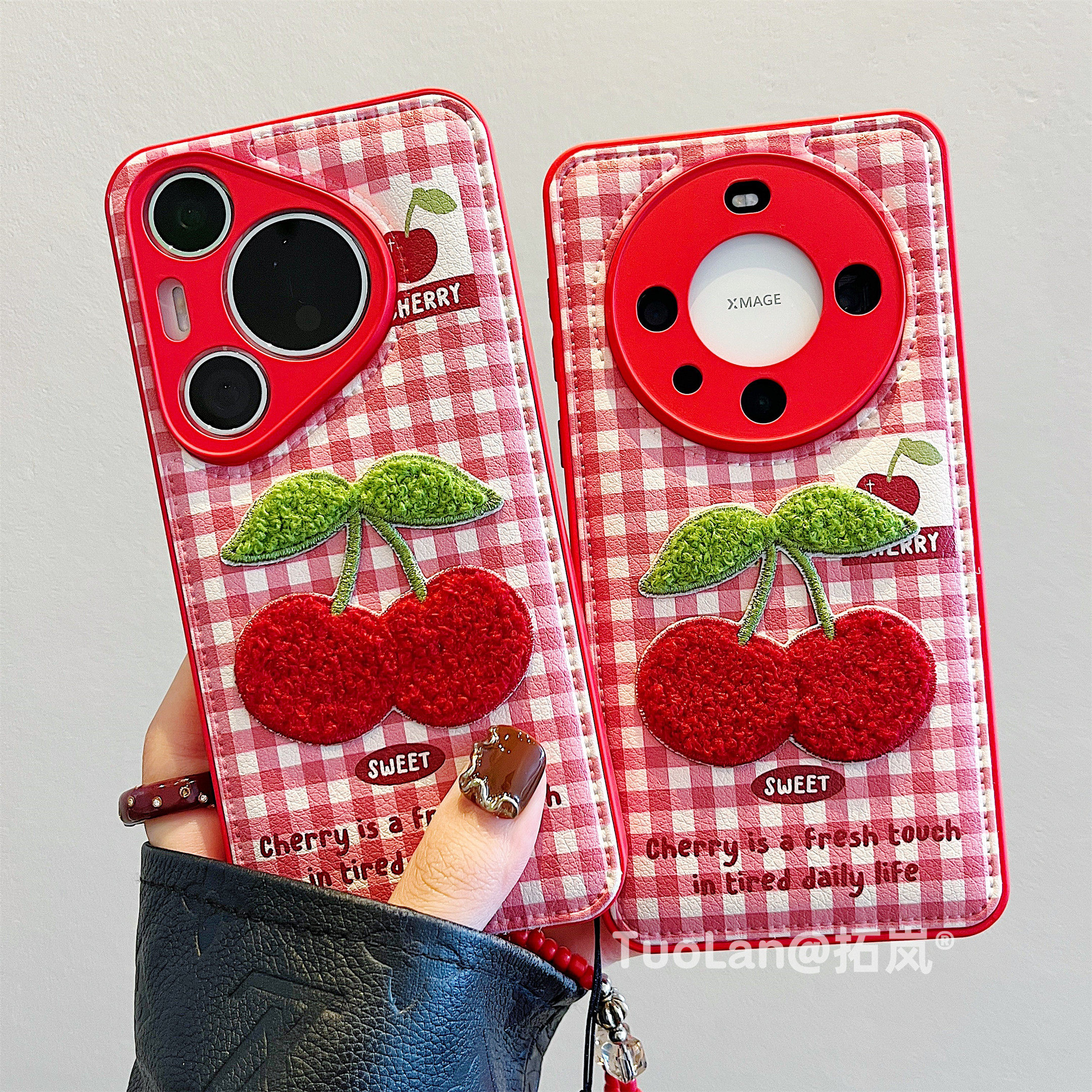 拓岚 适用华为mate60pro+新款手机壳pura70秋冬ultra红色格纹立体刺绣樱桃mate40/70pro皮质气垫挂绳全包女潮