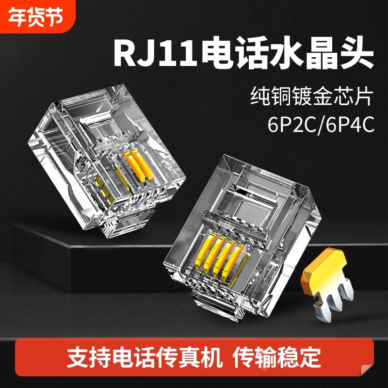 RJ11电话线水晶头2芯4芯电话座机传真机连接线插接头镀金6P2C/4C