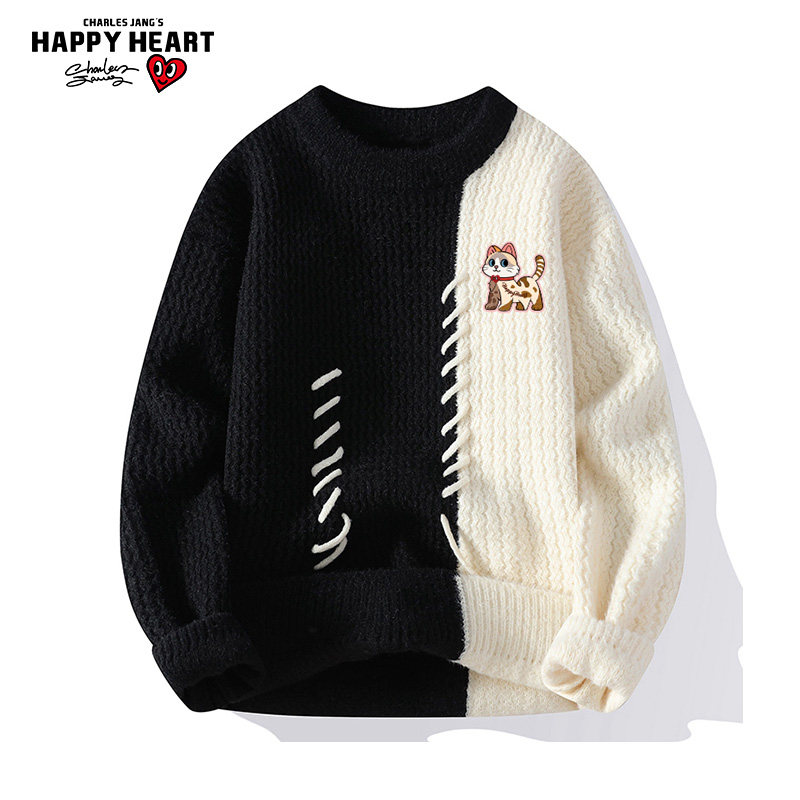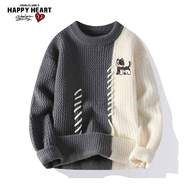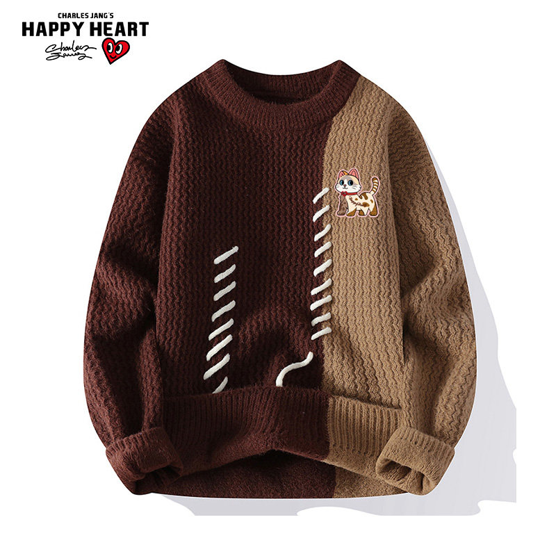 查尔斯桃心 魔术贴拼色圆领毛衣男女秋冬季复古休闲慵懒风针织衫