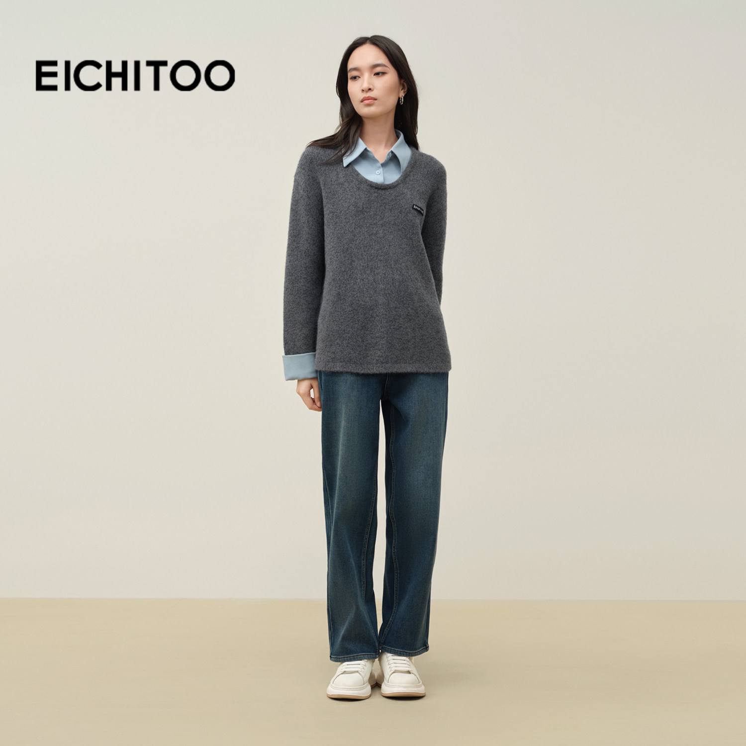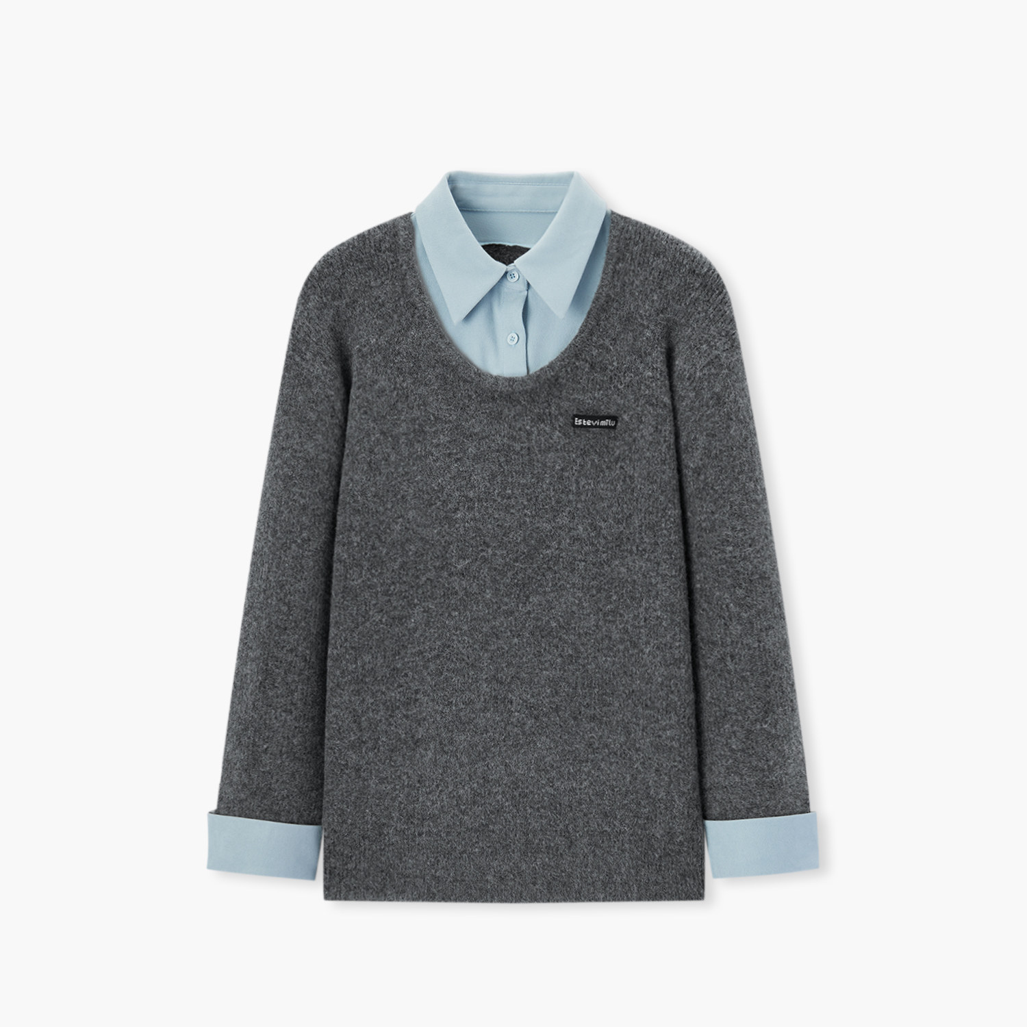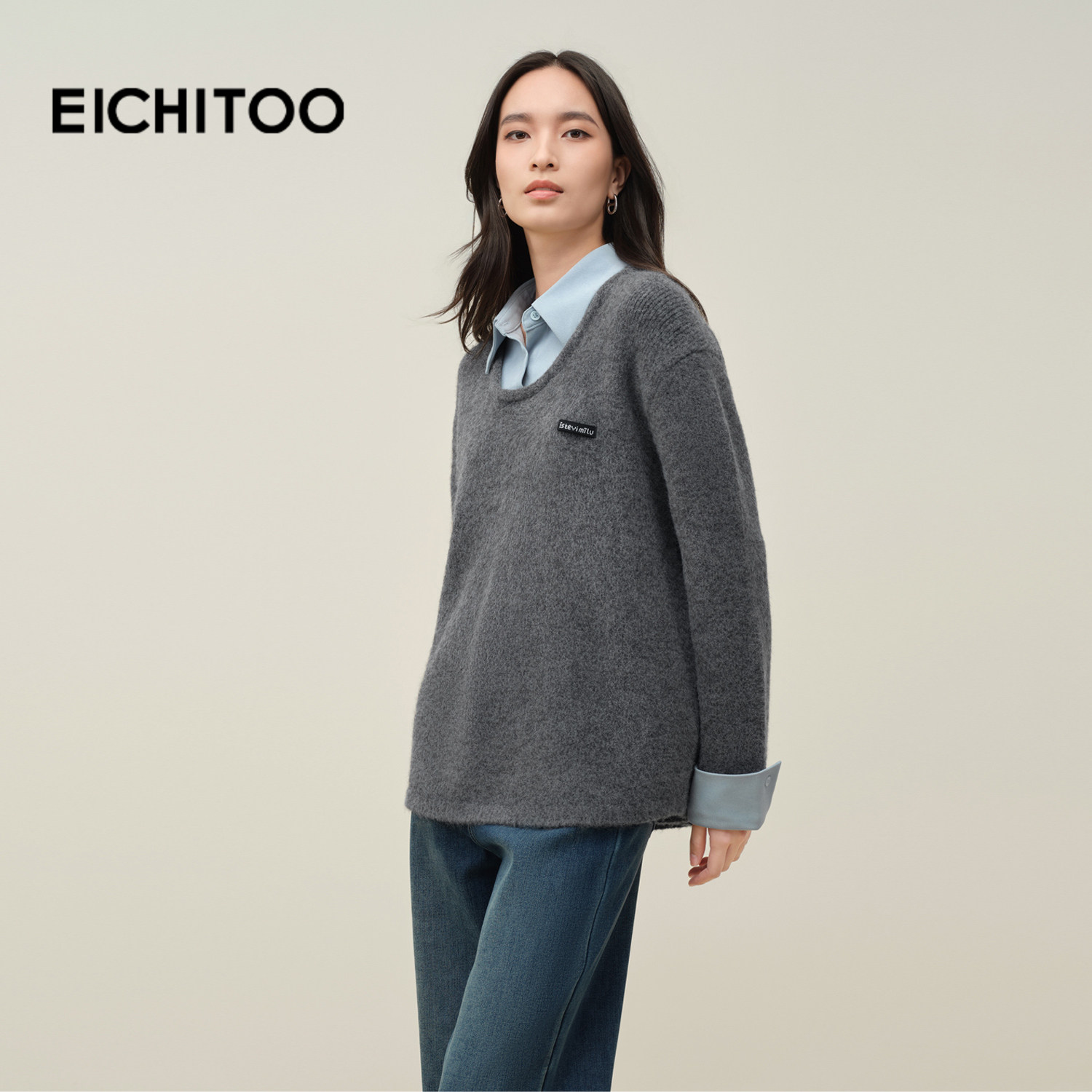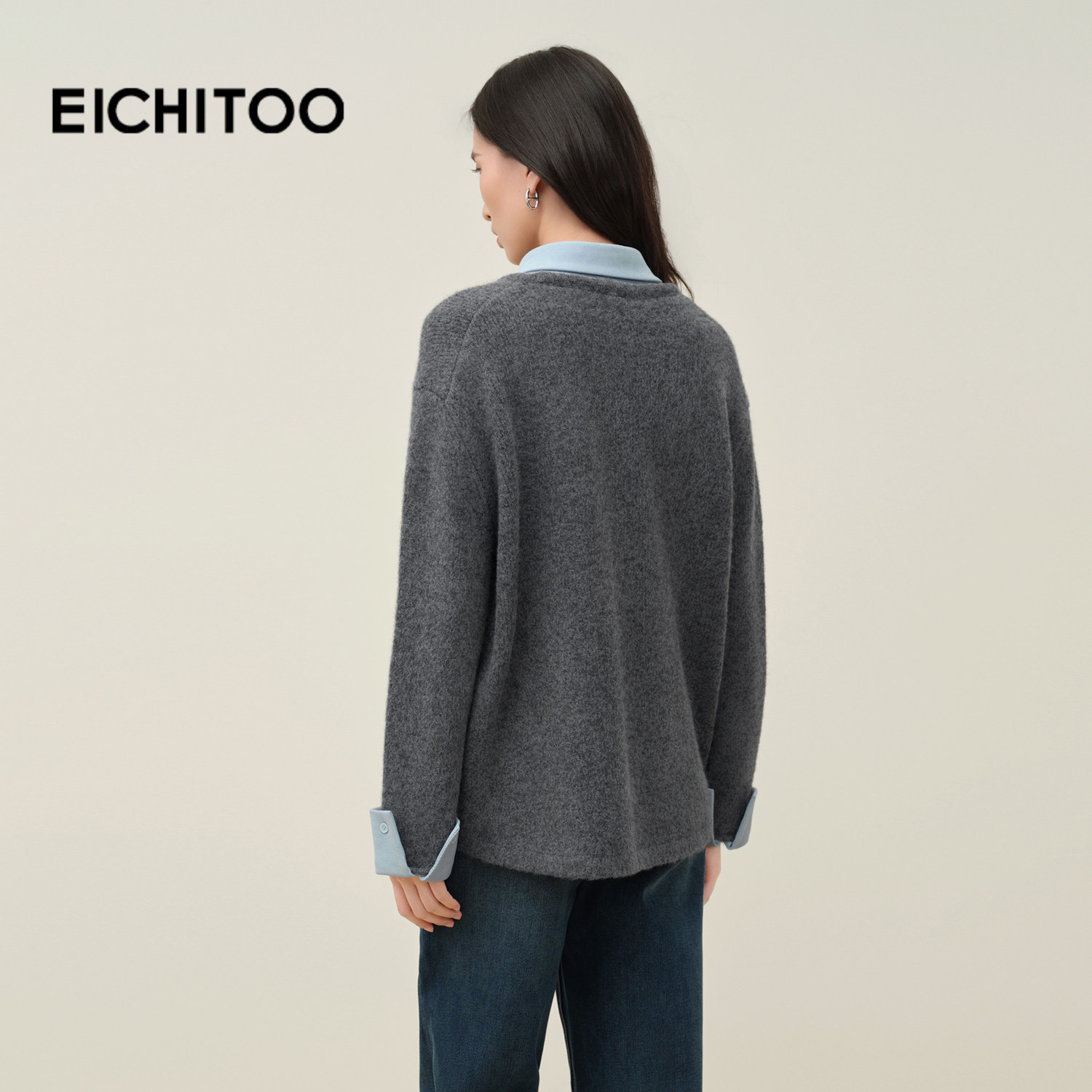 爱居兔灰色假两件polo领针织衫女2025年冬季新款宽松百搭休闲毛衣