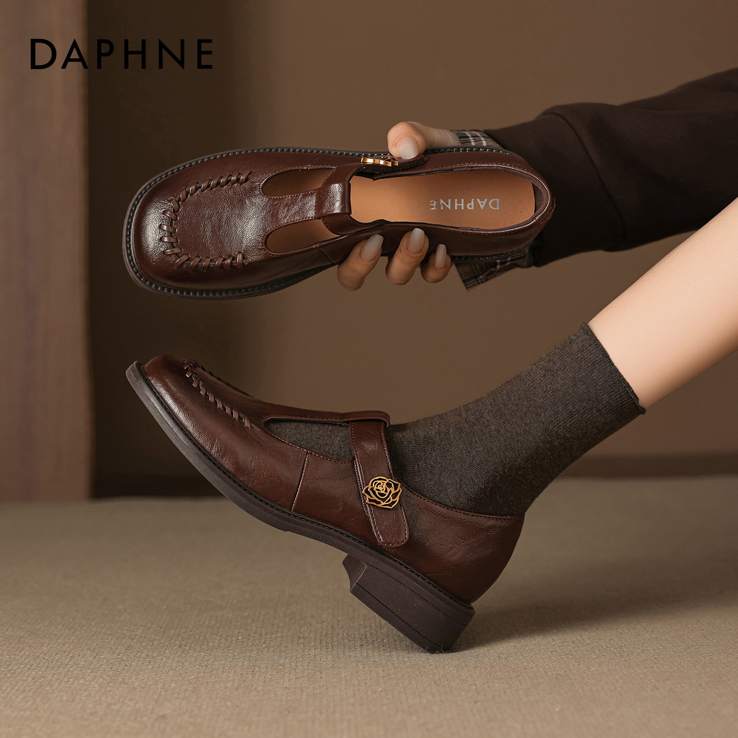 达芙妮浅口单鞋女2026新款春季棕色玛丽珍通勤复古粗跟皮鞋乐福鞋