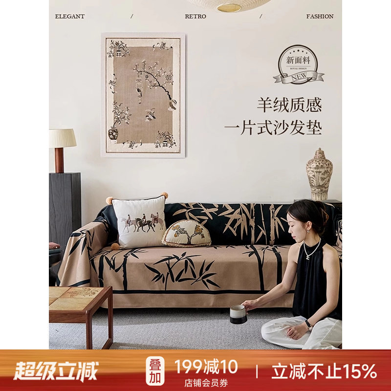 【孤品3折】蜡笔派月下竹影沙发垫中式复古类羊绒四季通用沙发套