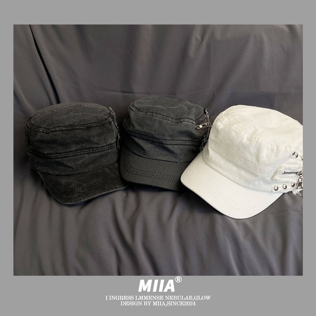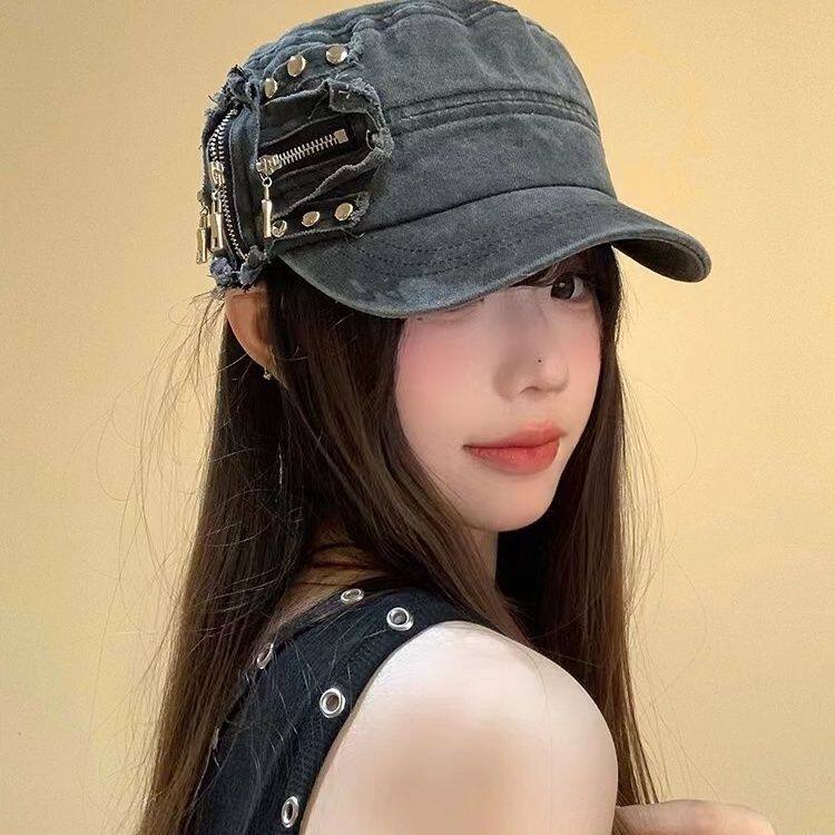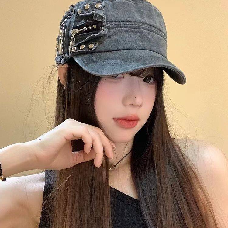 平顶牛仔街头复古铆钉水洗帽子小众美式鸭舌帽贝雷帽大头做旧显脸