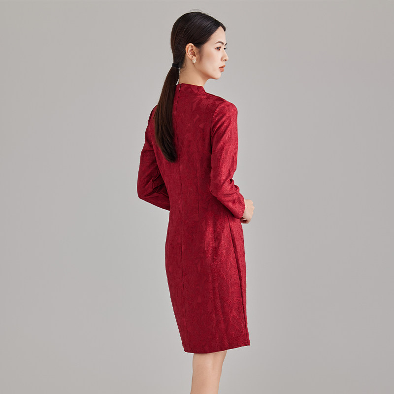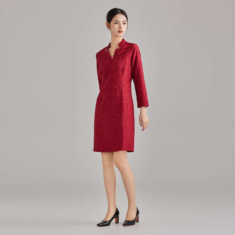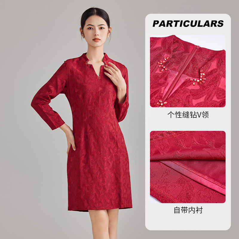 马天奴秋冬新款红色V领提花连衣裙子收腰婚宴长裙喜婆婆礼裙时尚