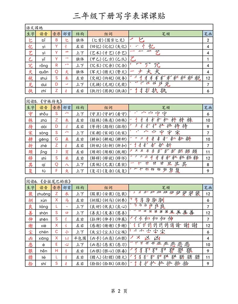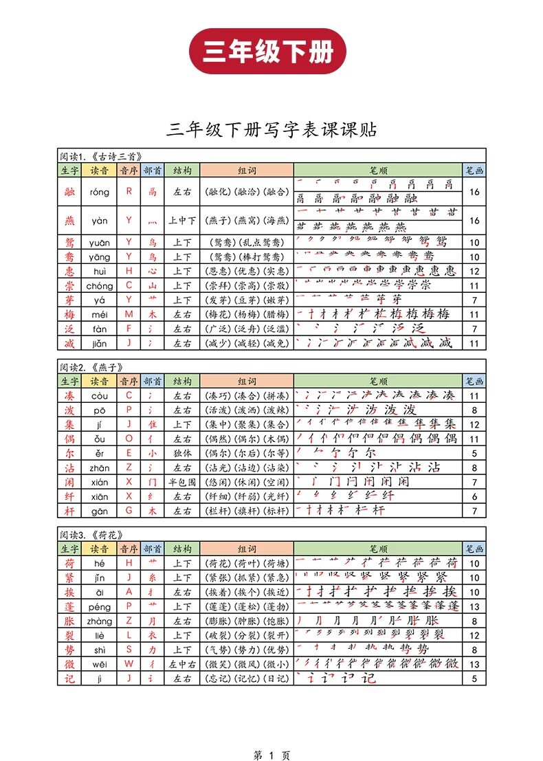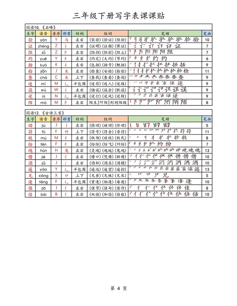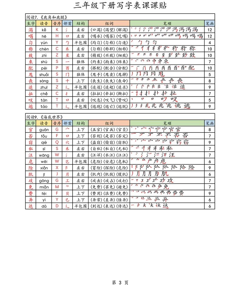 2026春新版三年级下册语文课课贴生字组词笔画笔顺不干胶自粘A4彩