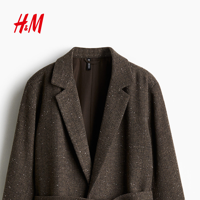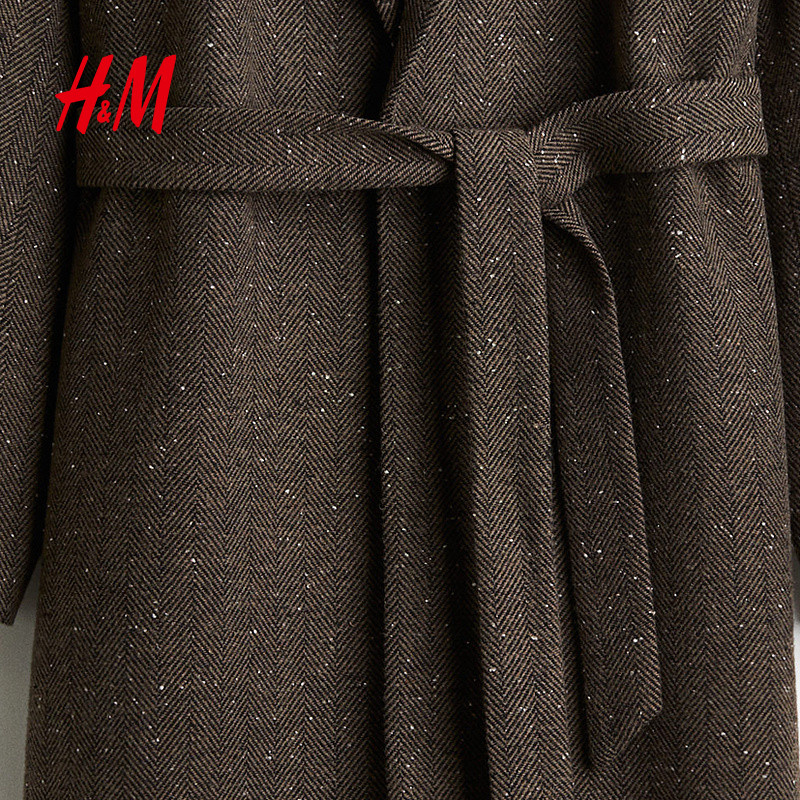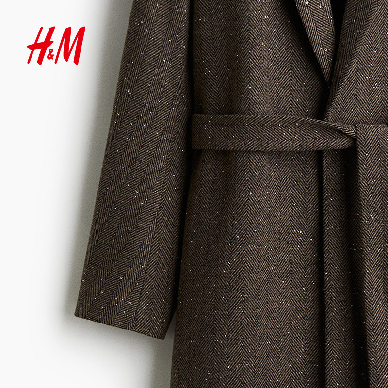 HM女装毛呢外套冬季时尚腰部系带保暖大衣1228998