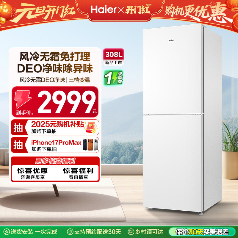 政府以旧换新补贴海尔双开两门冰箱308L小型租房家用白色风冷省电