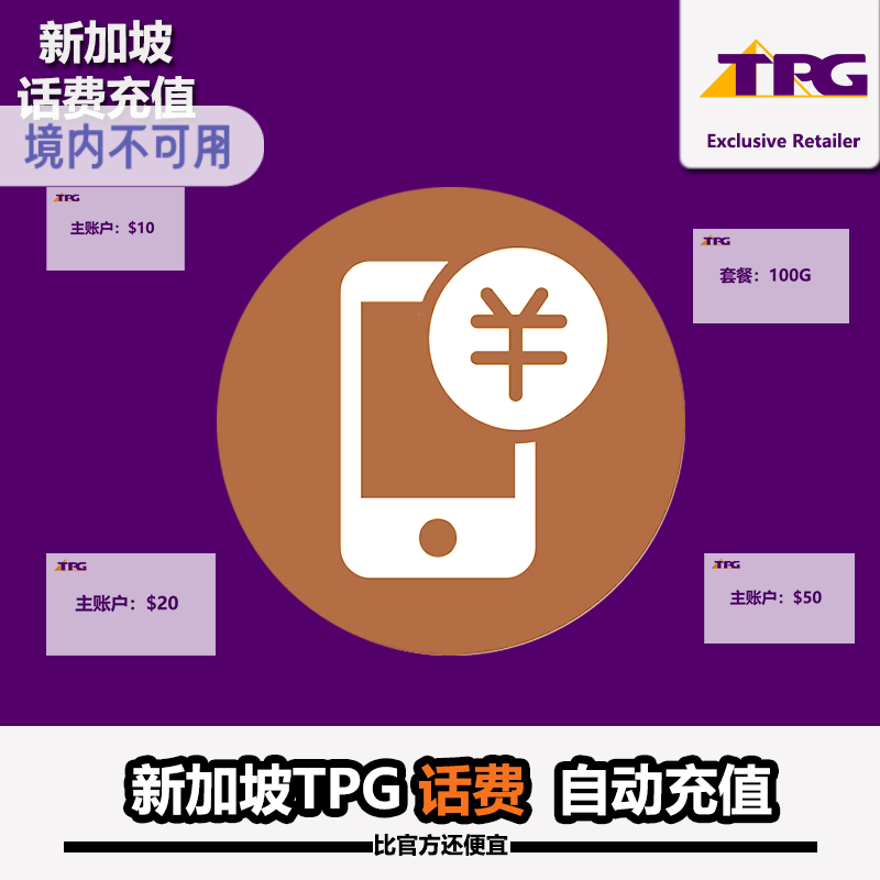 TPG话费充值,系统反应慢一般24小时才能到帐,太急不要拍 一旦下单,系统会进入排队状态无法取消,晚上排队慢 产品为自动充值,境外号码请填写新加坡号码,系统会自动识别65区号空格 充值前请务必关闭移动数据,因数据未关闭导致余额被扣光事件容易发生 去领券购买 ->
