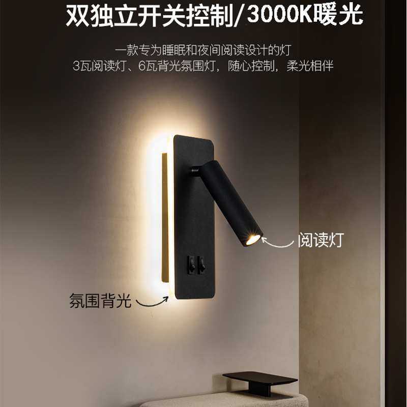 跨境壁灯方形卧室床头北欧现代简约创意长条带开关LED阅读射灯