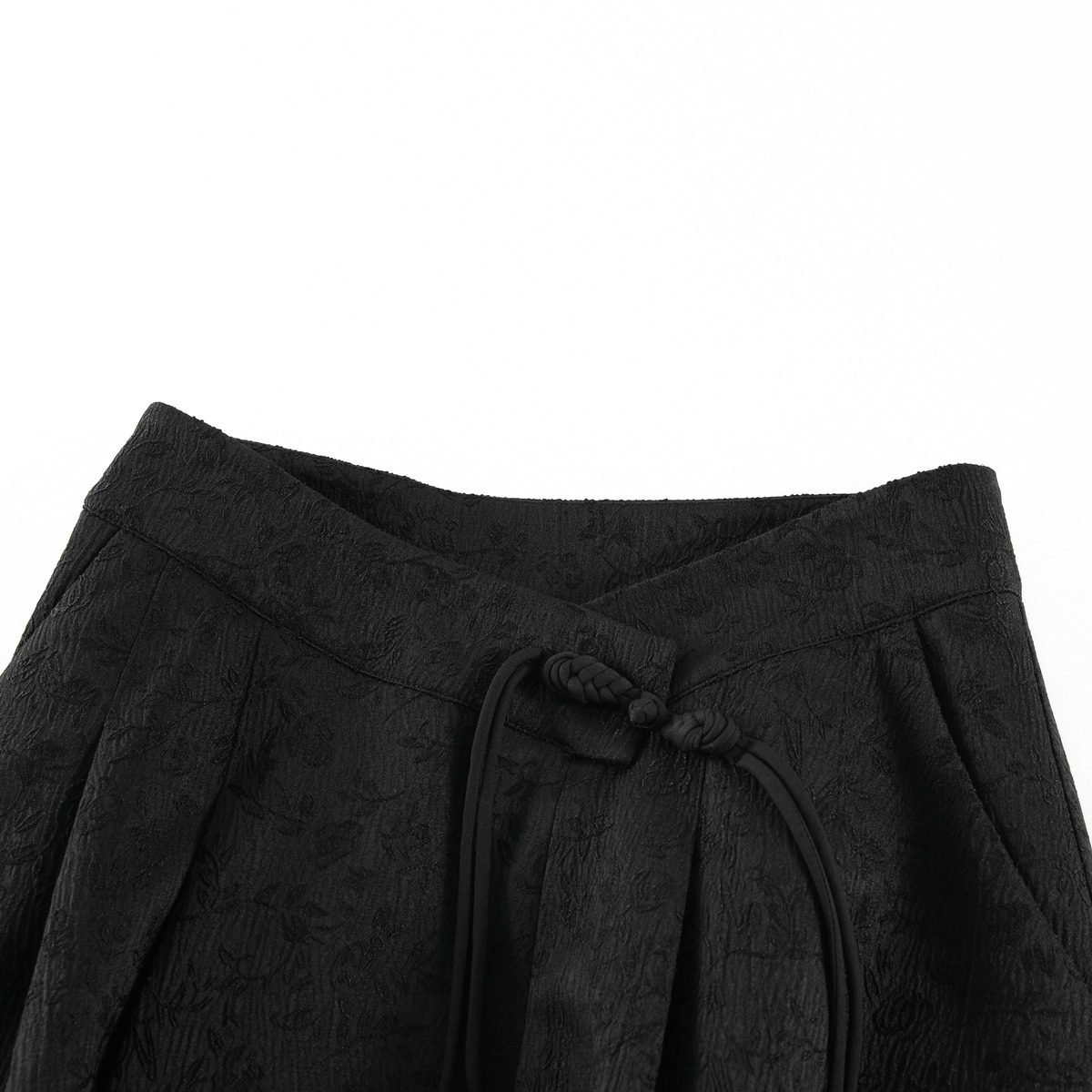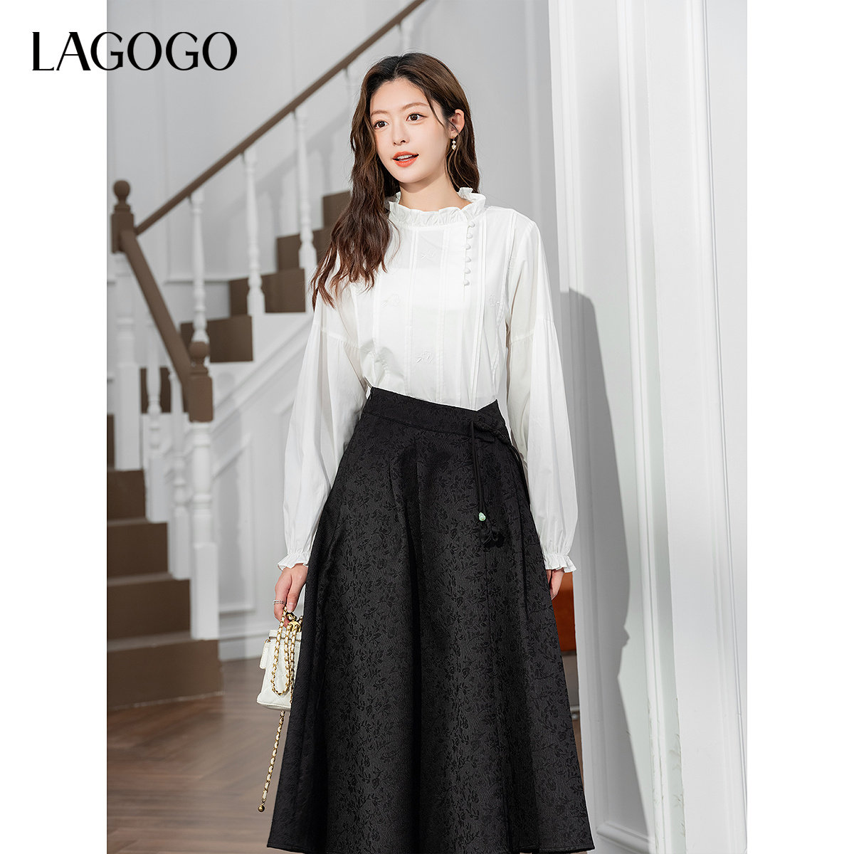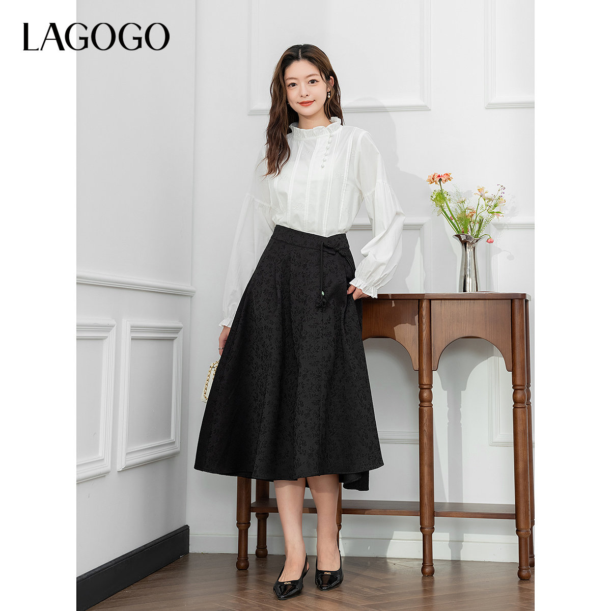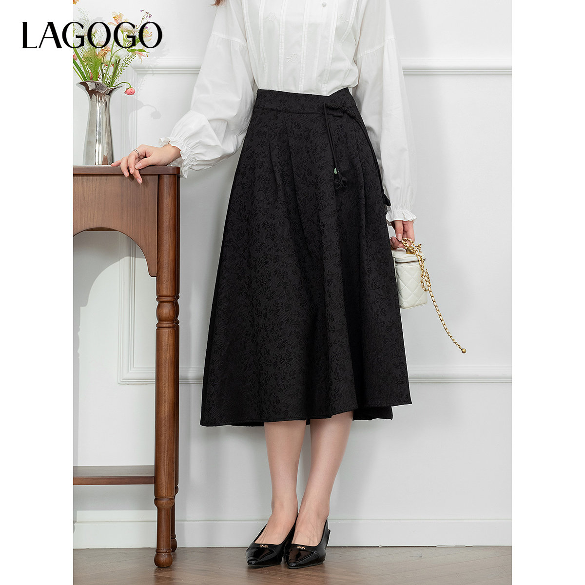 LAGOGO新中式提花半身裙女拉谷谷春秋新款黑色高腰显瘦复古裙子