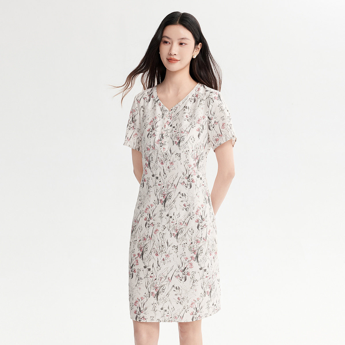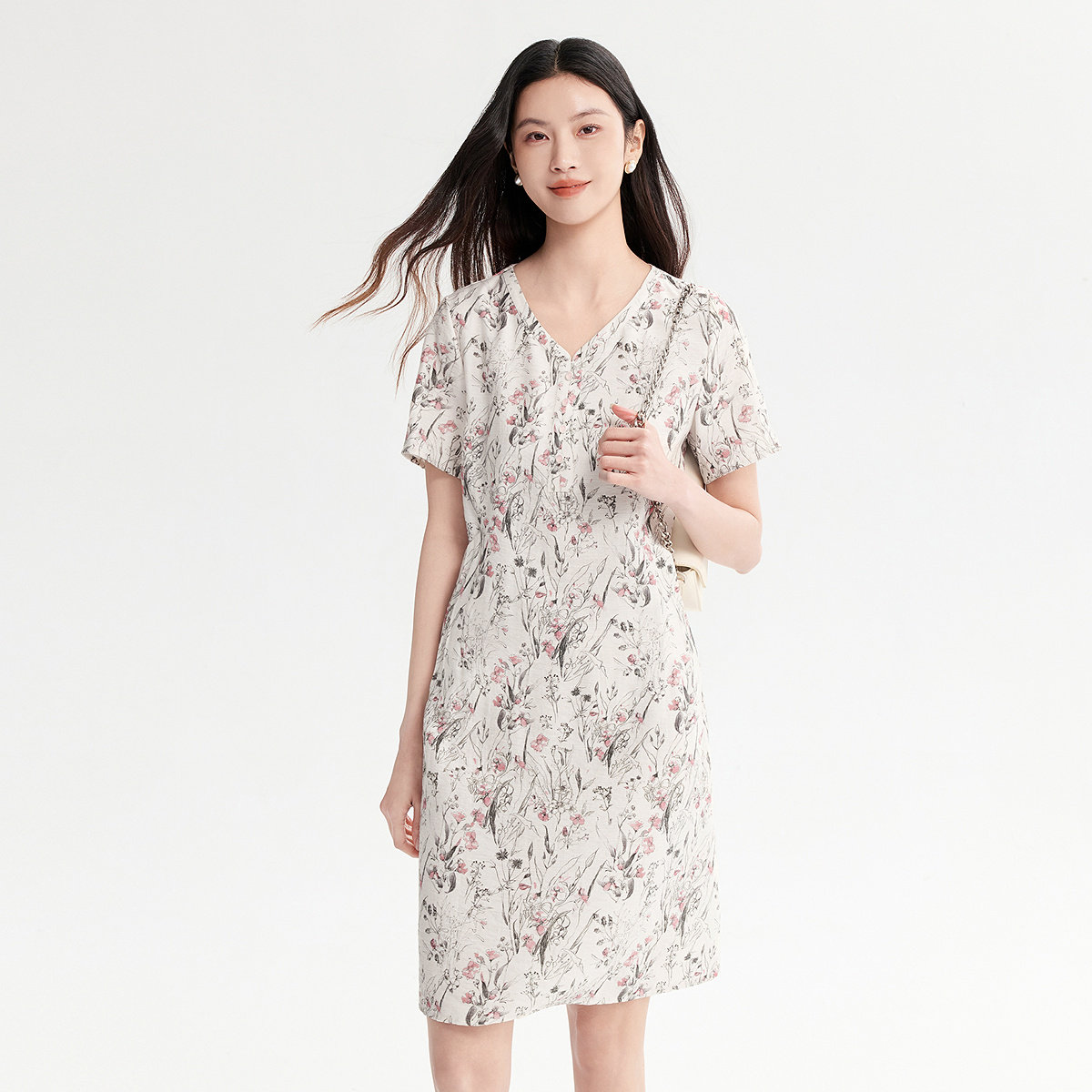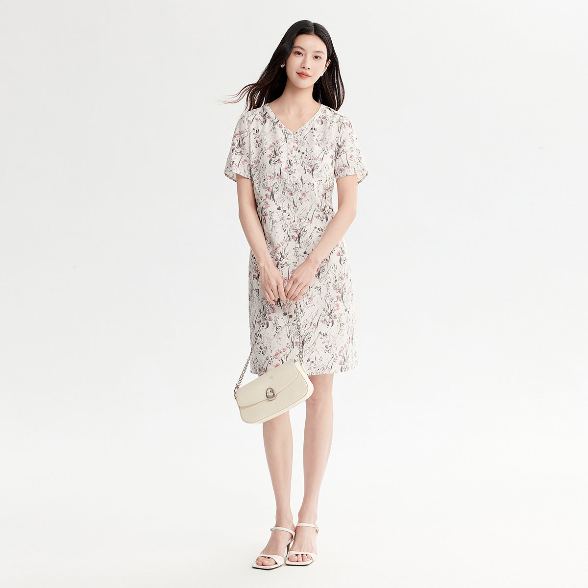 FINITY菲妮迪连衣裙26年夏季新款简约白底印花V领淑女雪纺长裙女