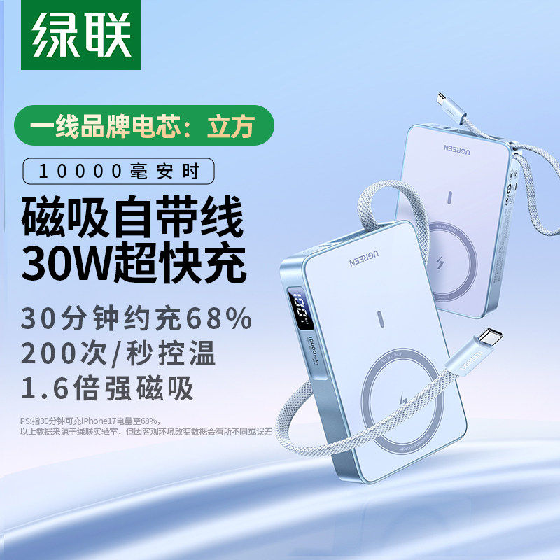 【充电宝3C认证可上飞机】绿联2026新款10000毫安磁吸无线充电宝30W自带线适用于苹果17专用magsafe官方正品