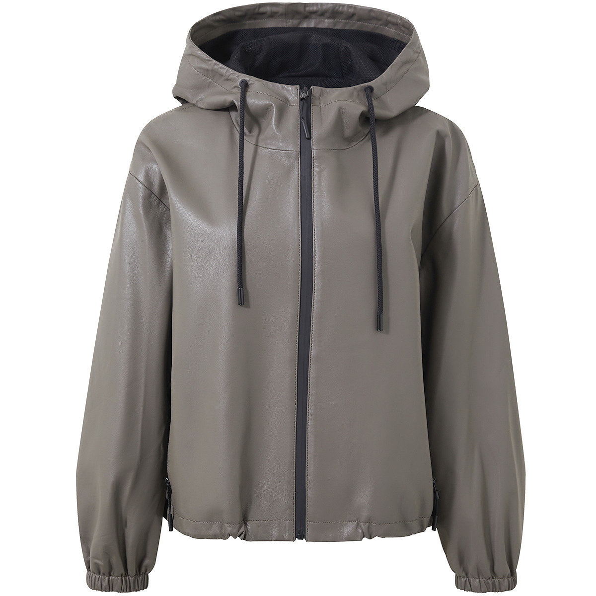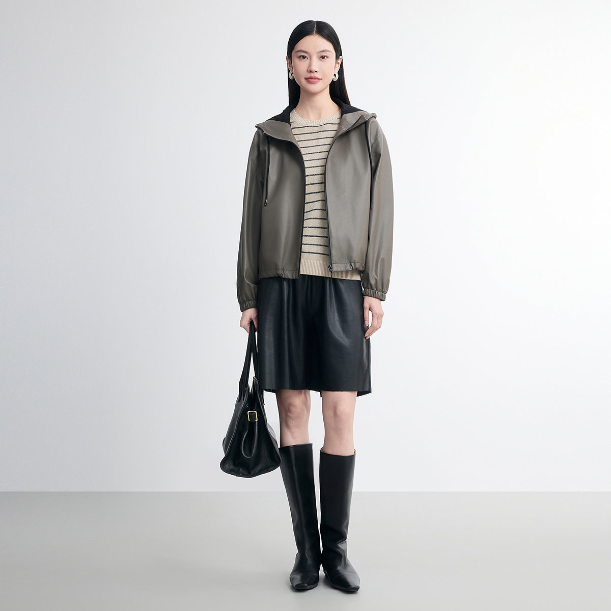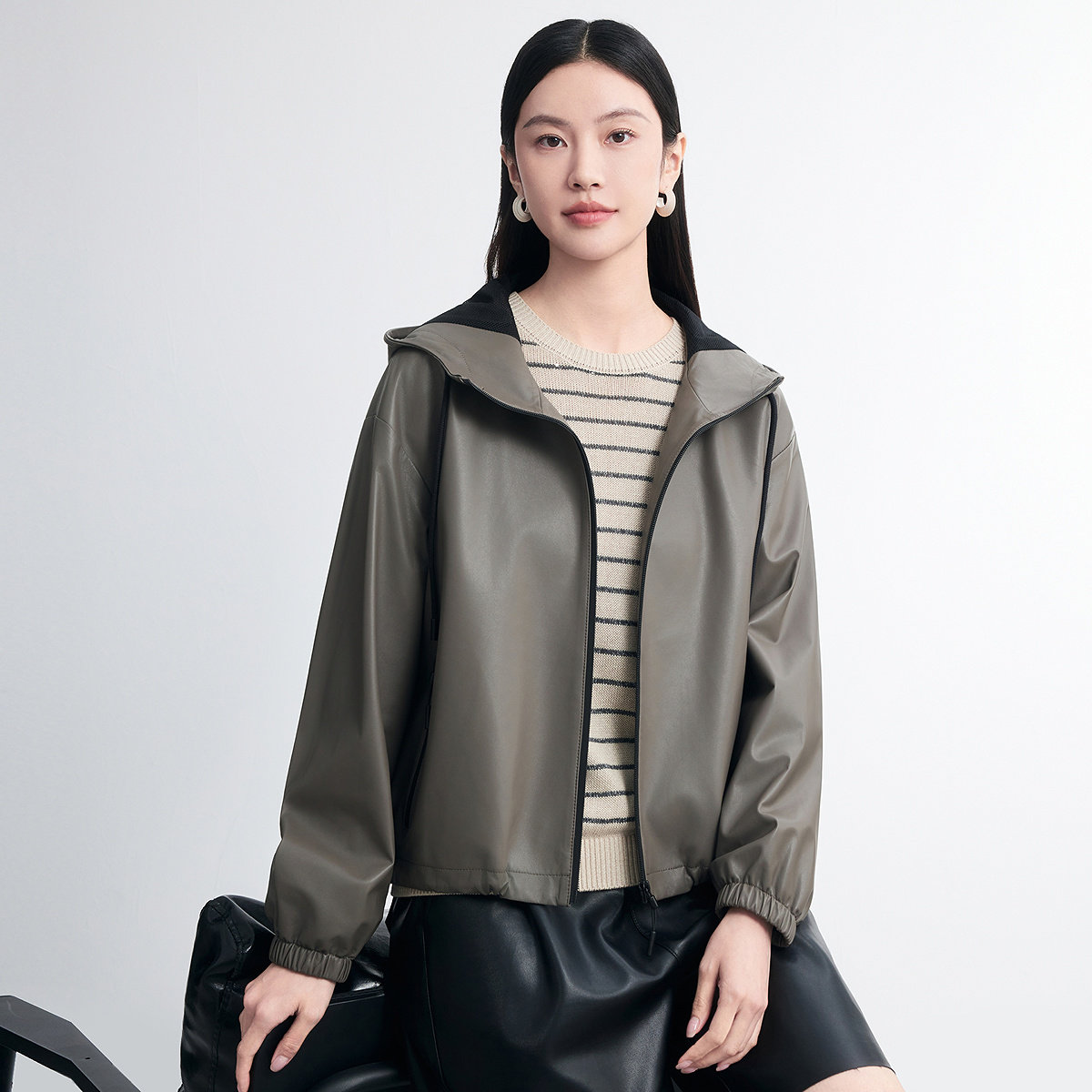 FINITY菲妮迪真皮皮衣2026春新款灰色连帽羊皮短款修身短外套女