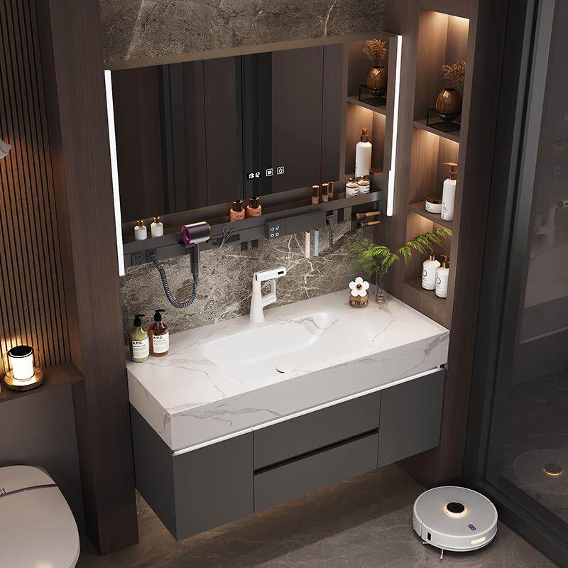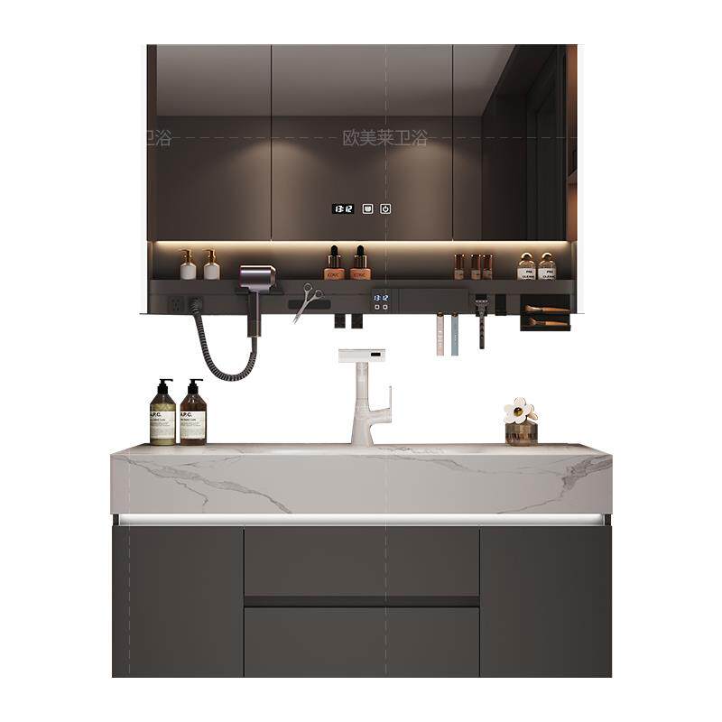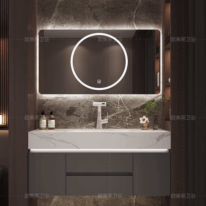 轻奢奶油风岩板热弯一体盆浴室柜组合卫生间洗漱台洗脸洗手盆实木