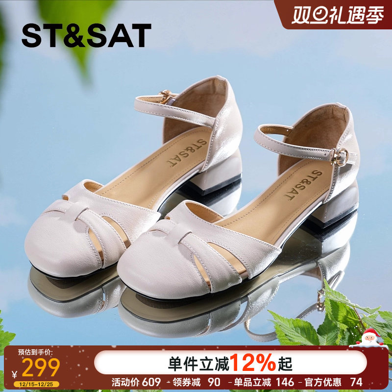 星期六夏季包跟低跟罗马凉鞋女2025新款外穿真皮中空包头女鞋粗跟