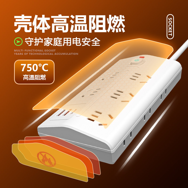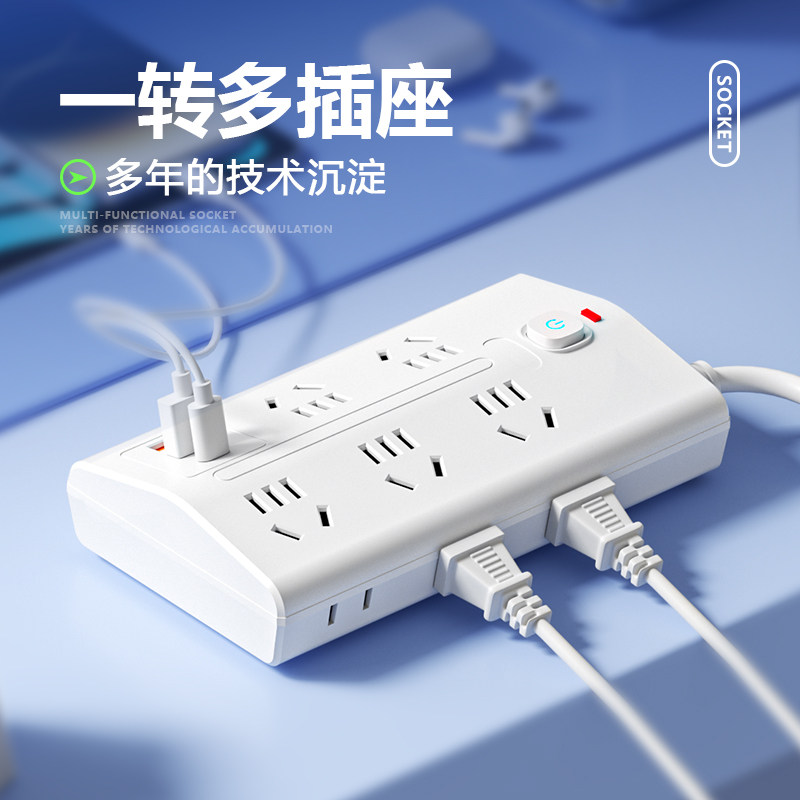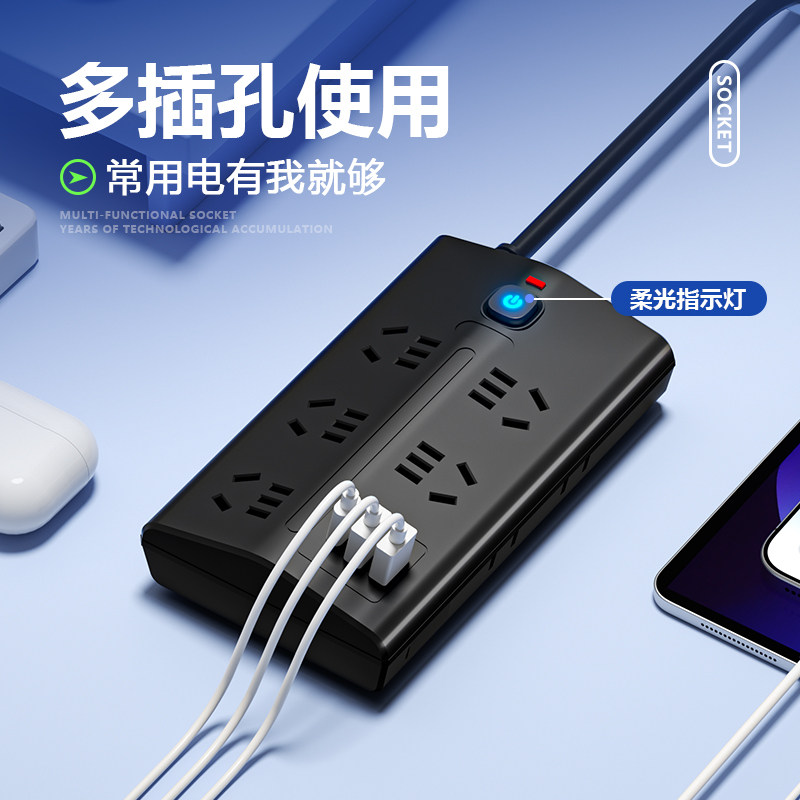 多功能斜面梯形设计插座家用扩展多孔USB接线板排插线拖线板