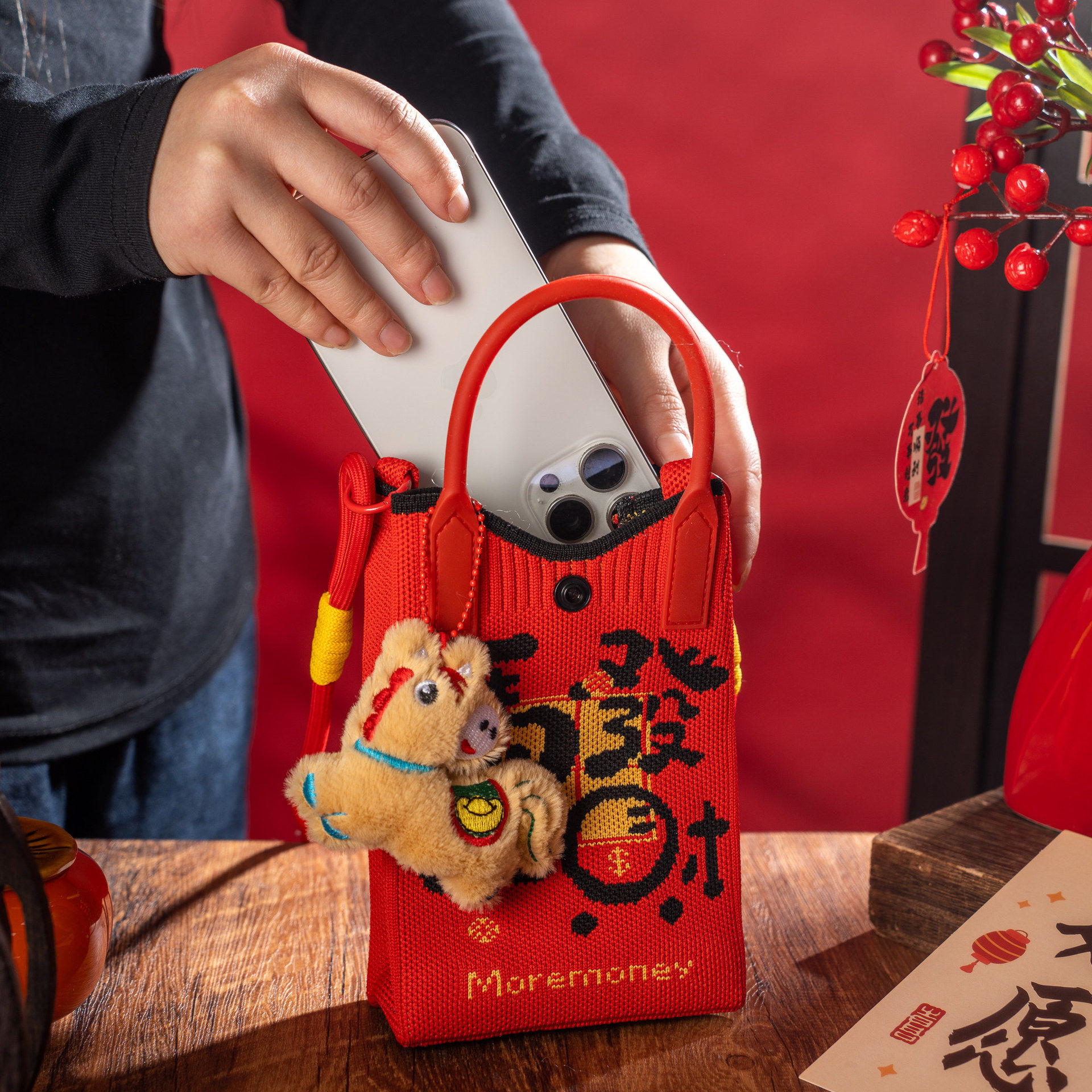 新年发财针织手提包迷你手机包斜挎百搭大容量红色喜庆马年单肩包