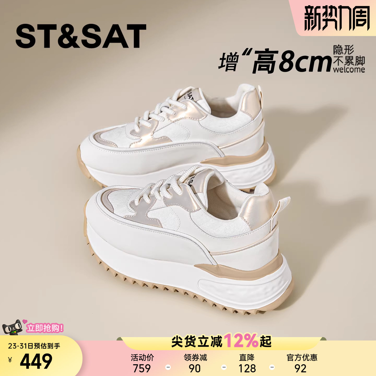 星期六8CM内增高板鞋女款小个子厚底小白鞋轻便阿甘休闲百搭德训