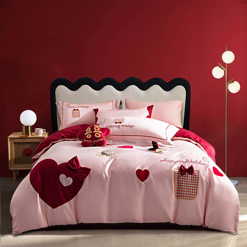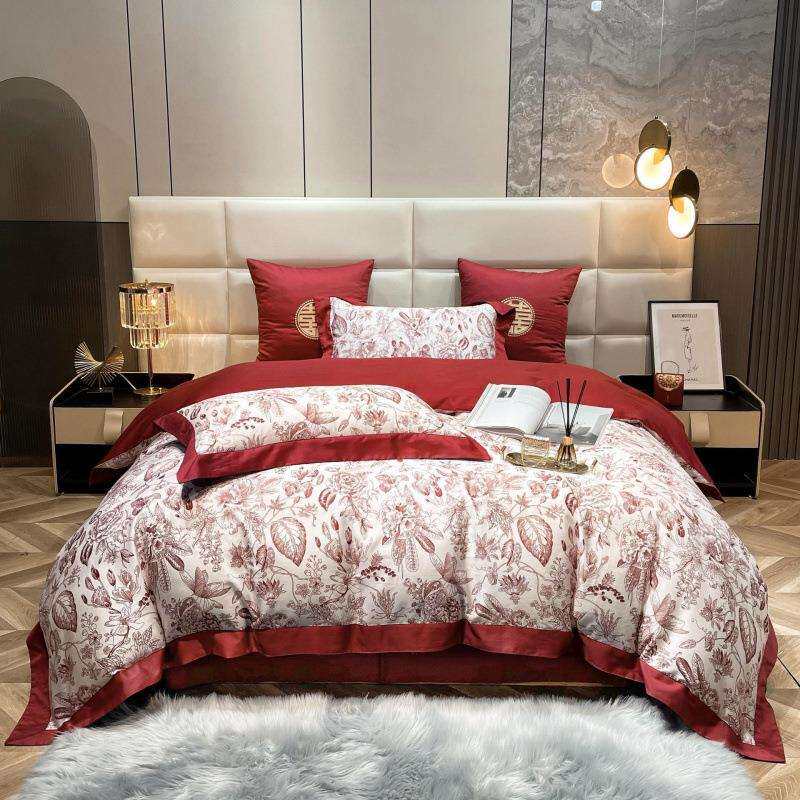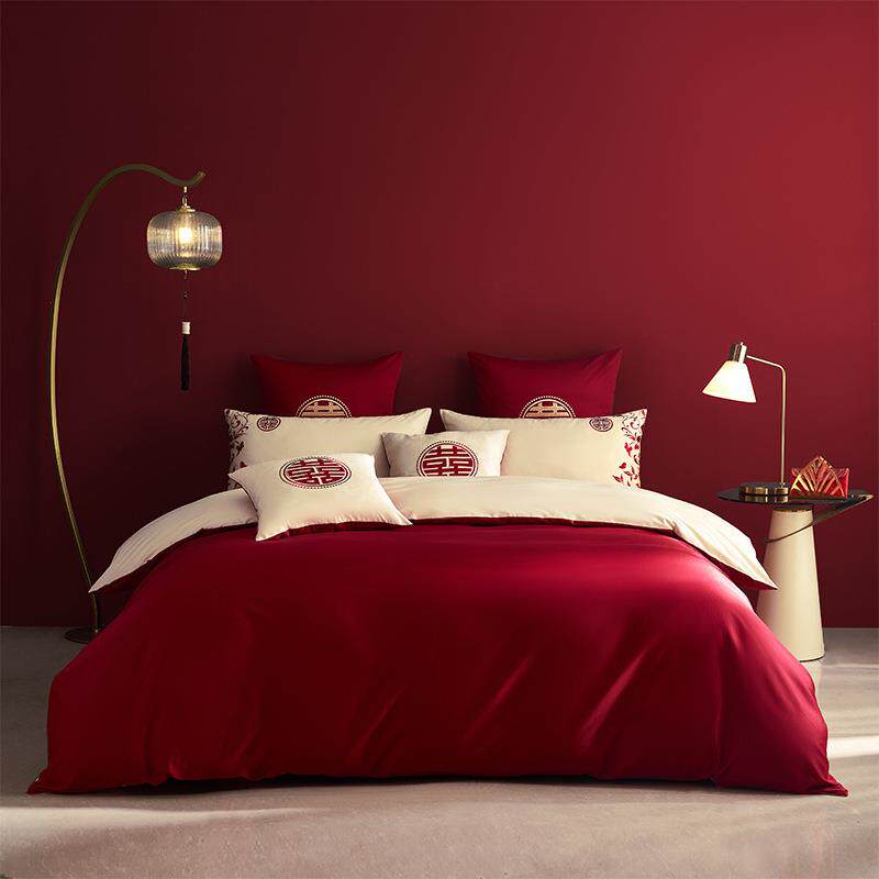 高端大气结婚婚床上用品四件套纯棉全棉婚庆套件酒红色系新婚喜被