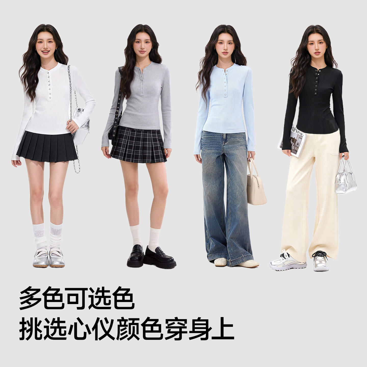 三福打底衫女2026新款春季简约纯色收腰V领修身休闲长袖上衣女装