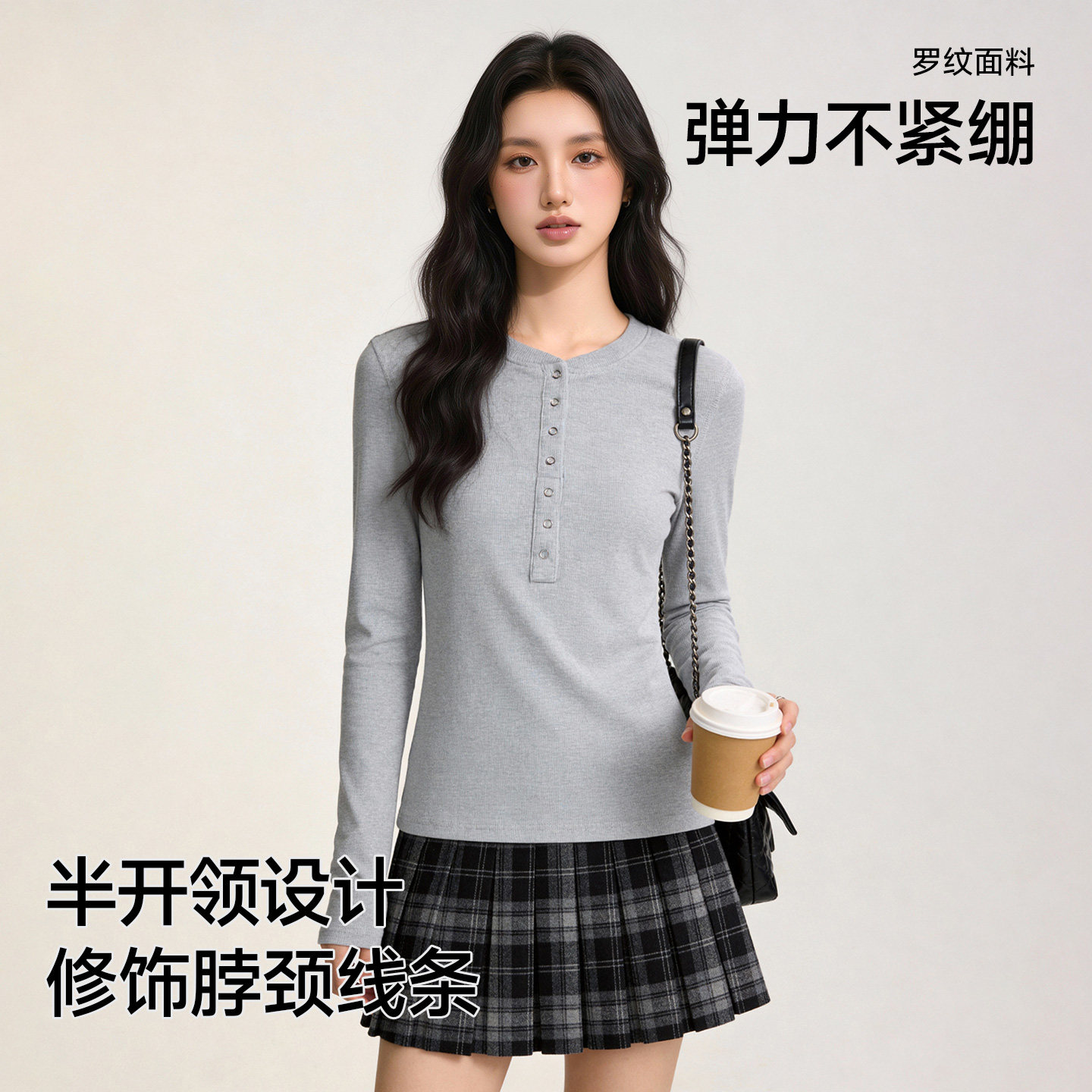 蕉下亨利衫女长袖T恤v领秋冬修身保暖低领打底衫半开领白色上衣