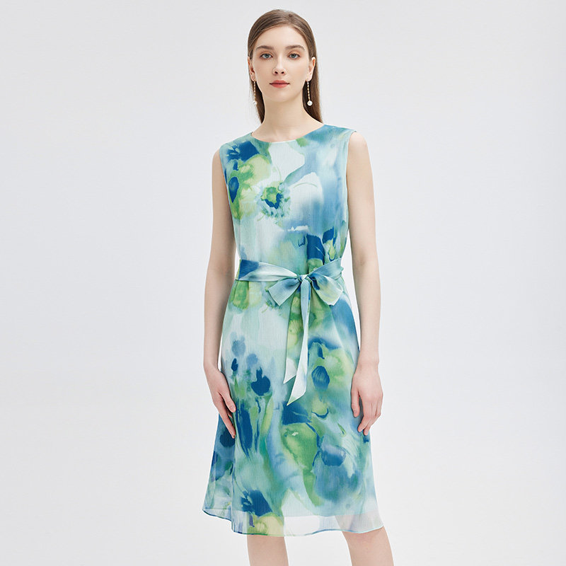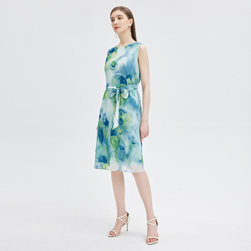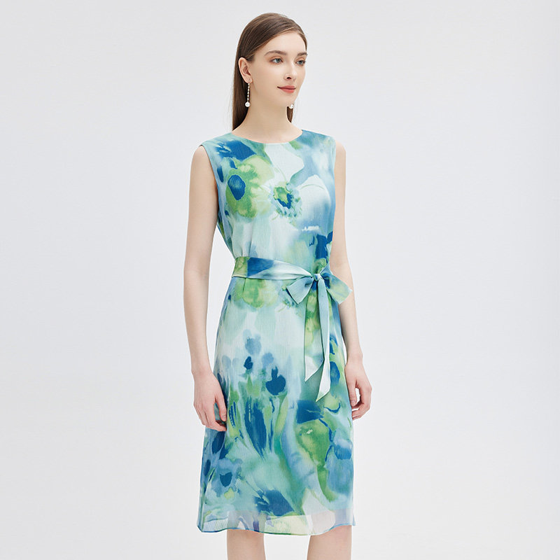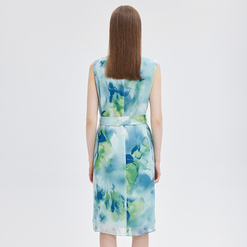 专柜正品马天奴夏季绿色晕染印花连衣裙子气质多巴胺无袖雪纺