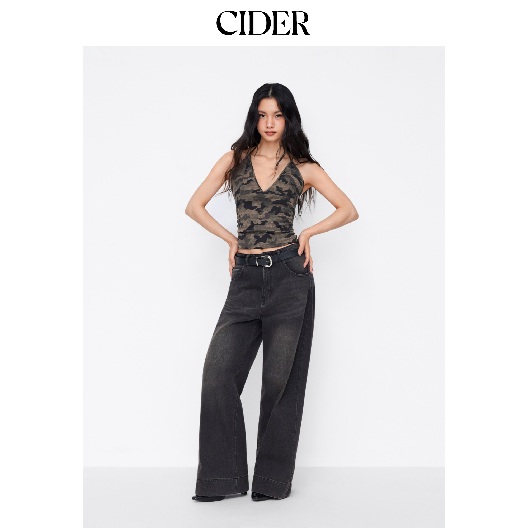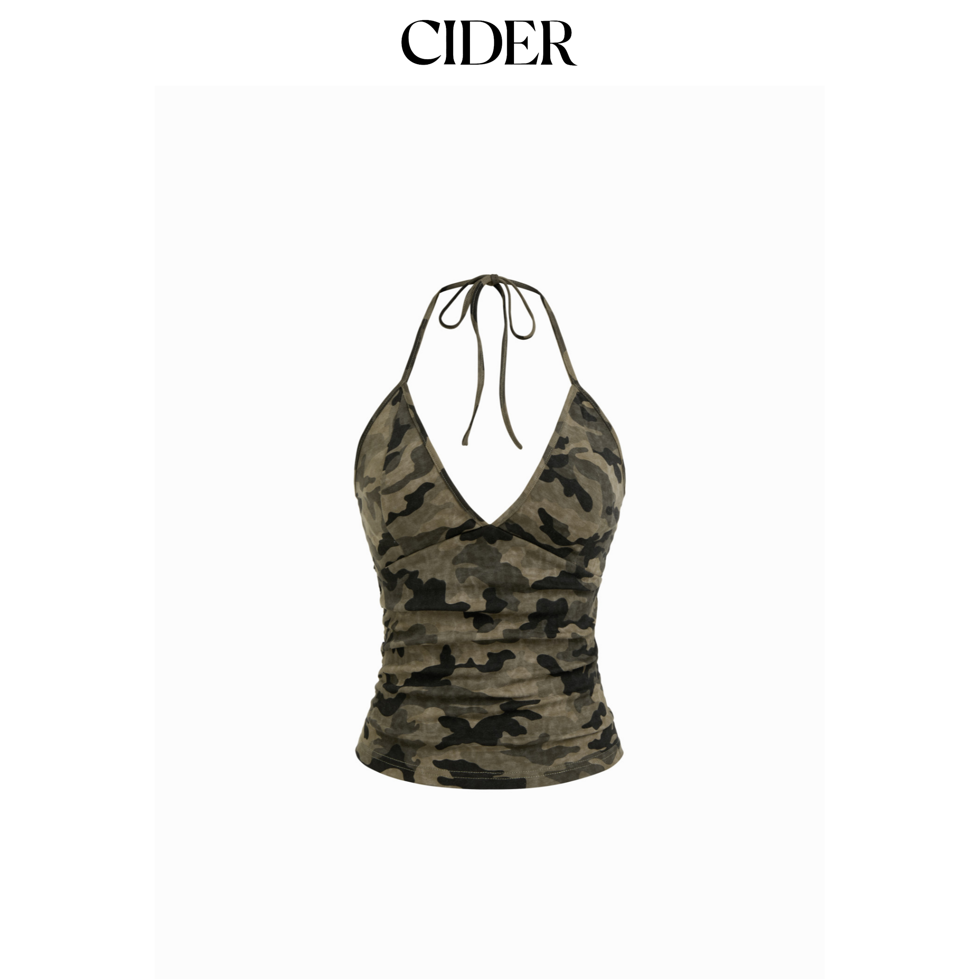 CIDER棉混纺迷彩挂脖V领抽褶短款抹胸上衣115002315
