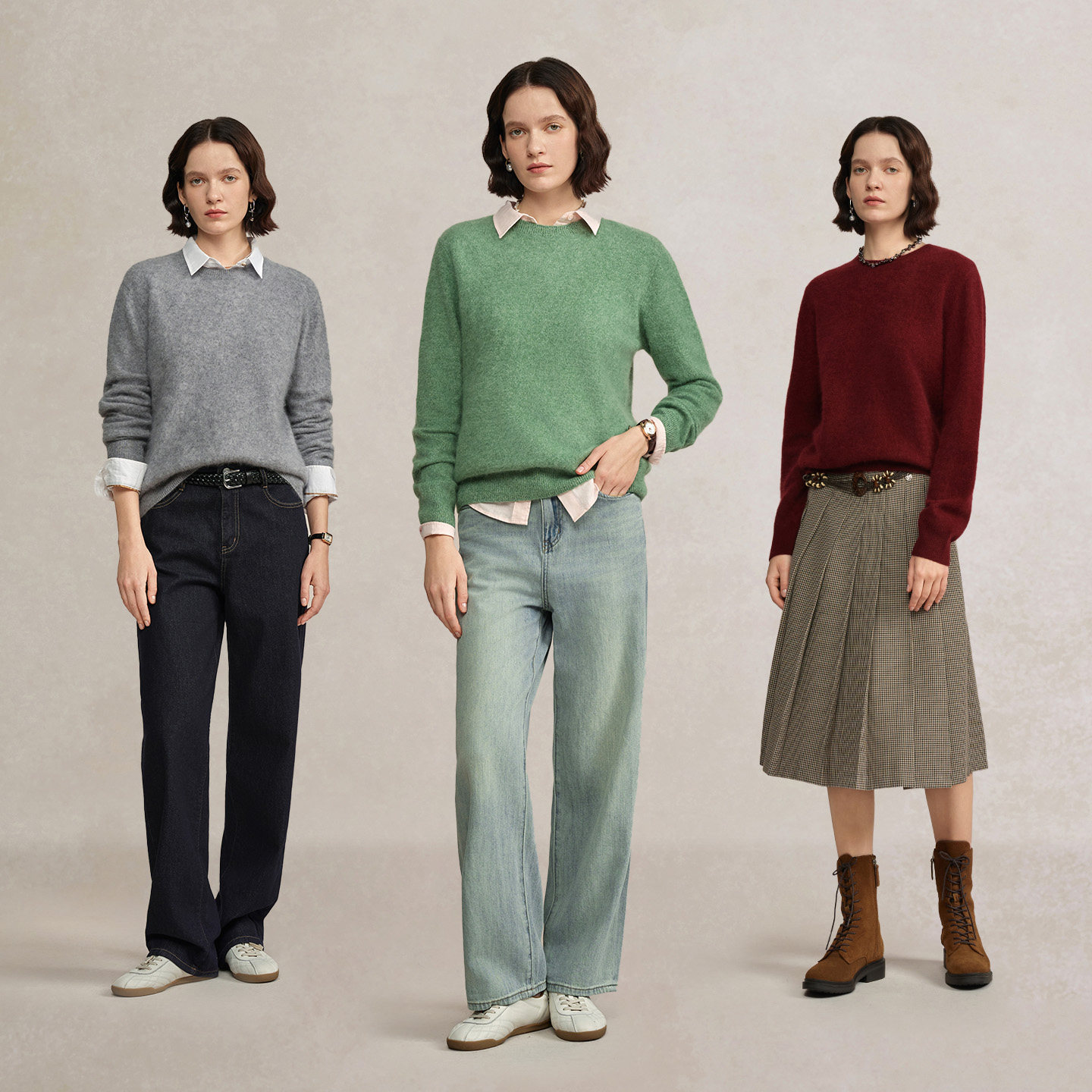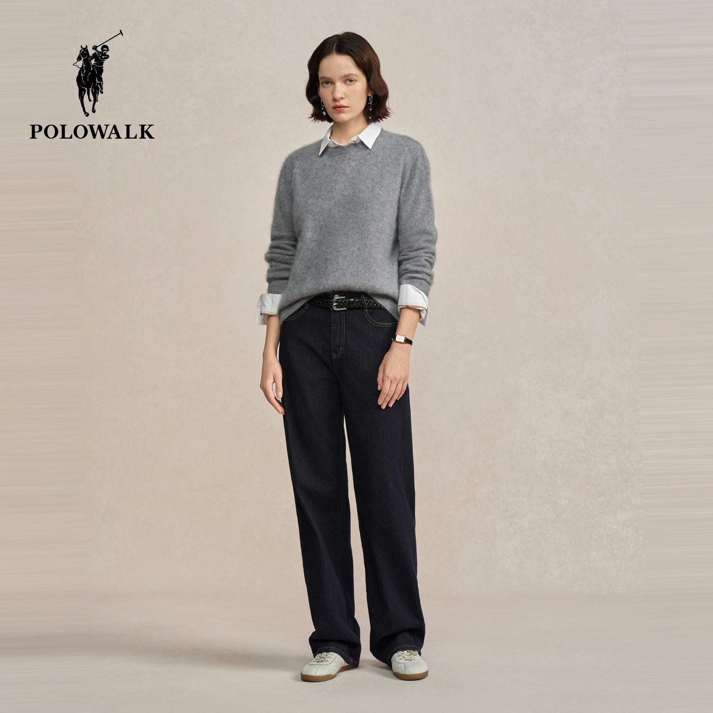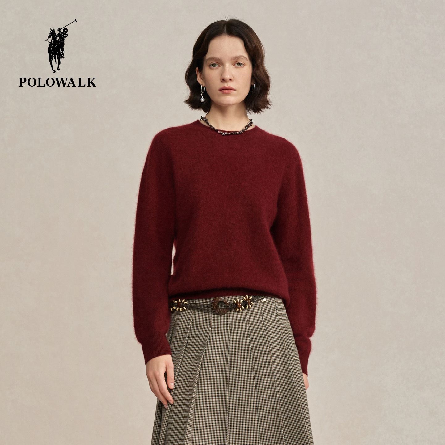 POLOWALK女装2026春季新款女士羊毛衫圆领拉毛针织衫红色套头毛衣
