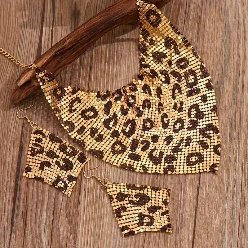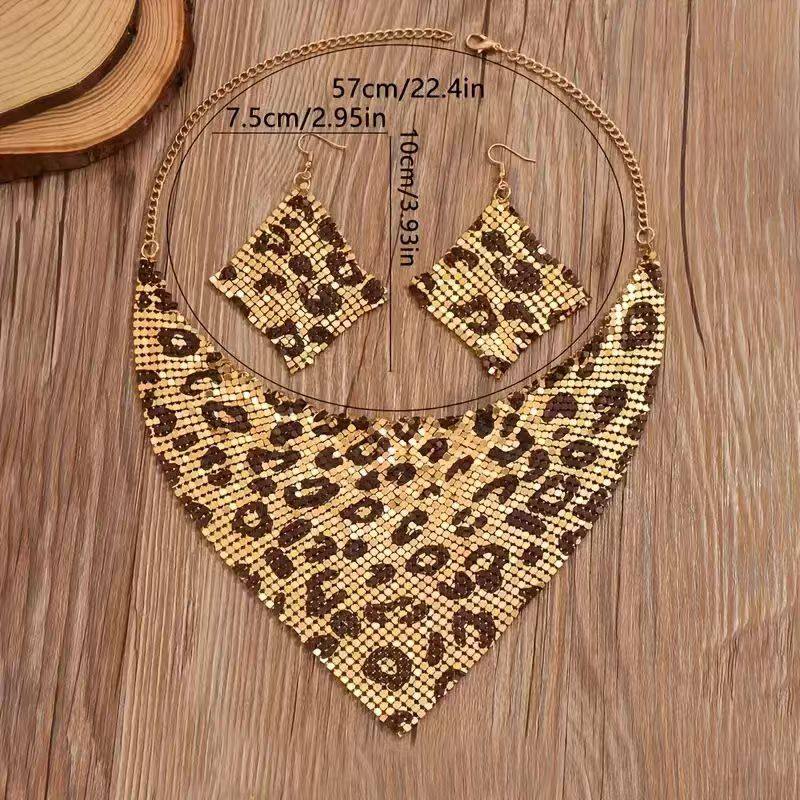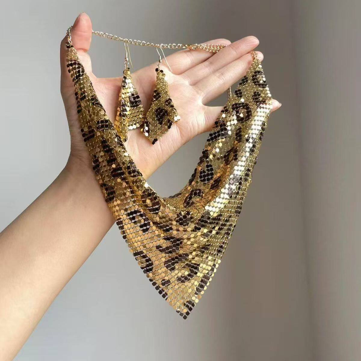 欧美豹纹亮珠片女士三角巾项链+耳环个性潮流首饰套装夸张锁骨链