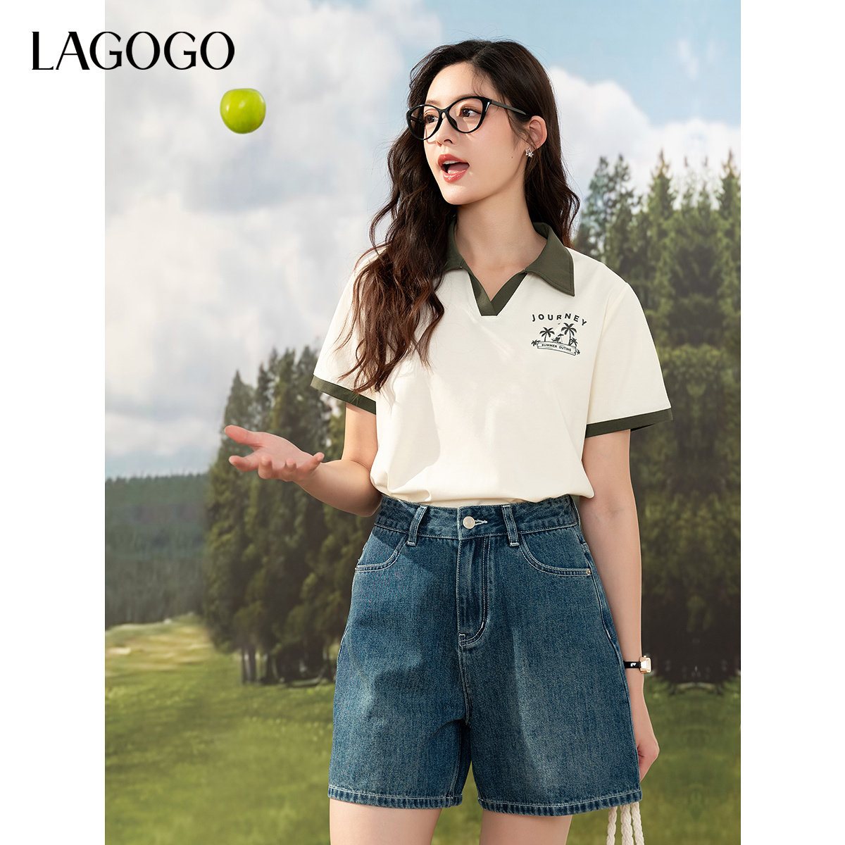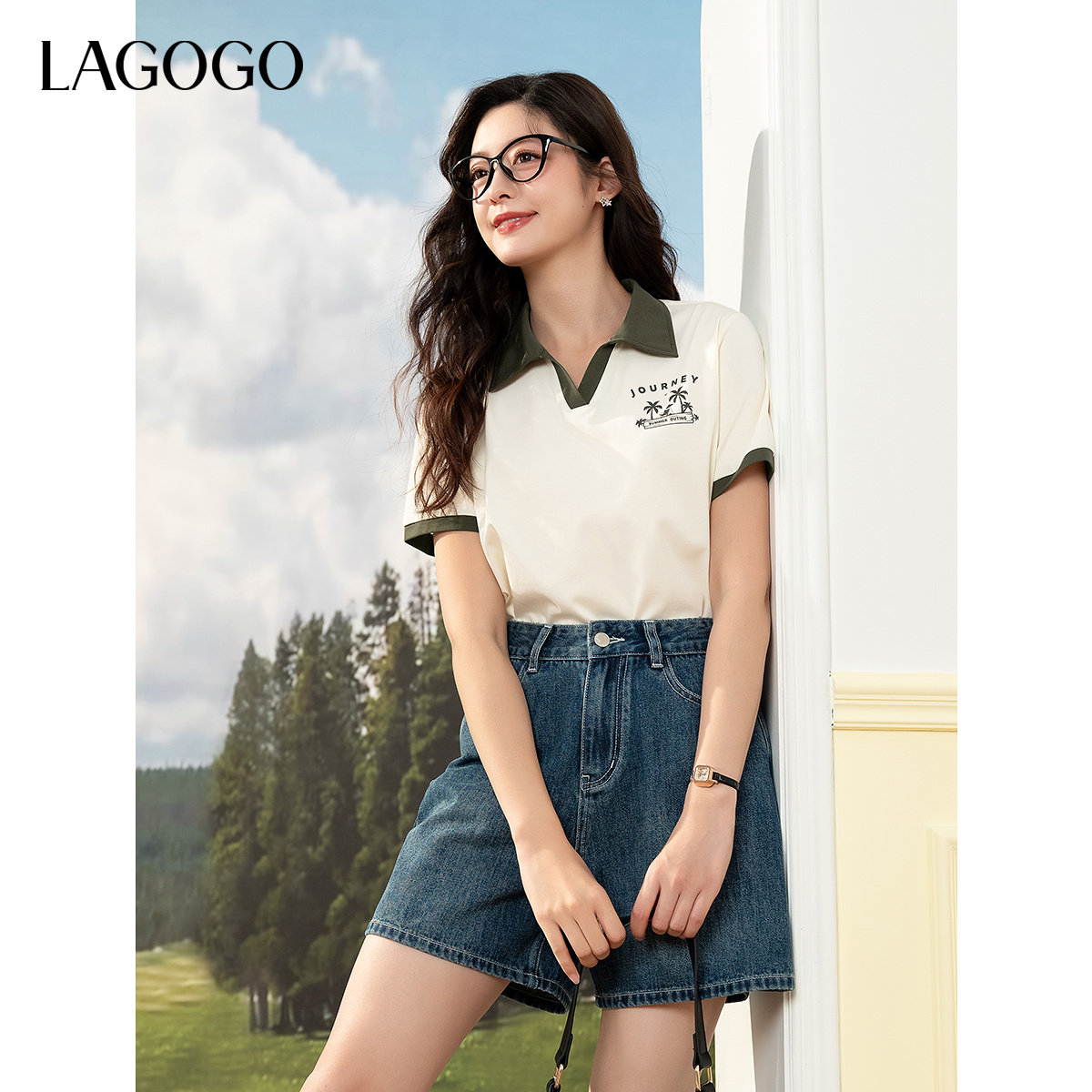 LAGOGO美式度假休闲T恤女拉谷谷2026夏季款撞色翻领趣味印花上衣