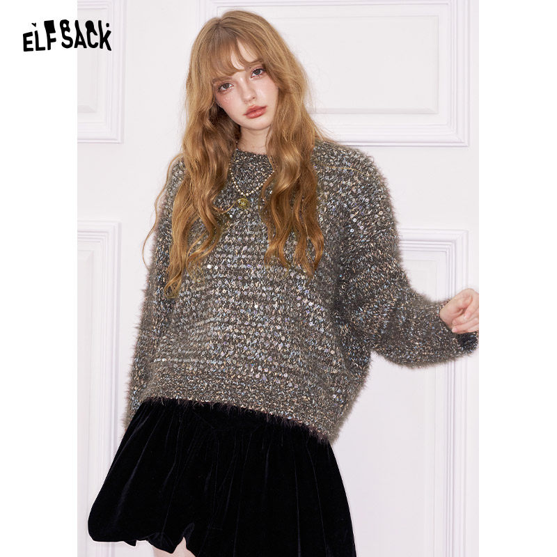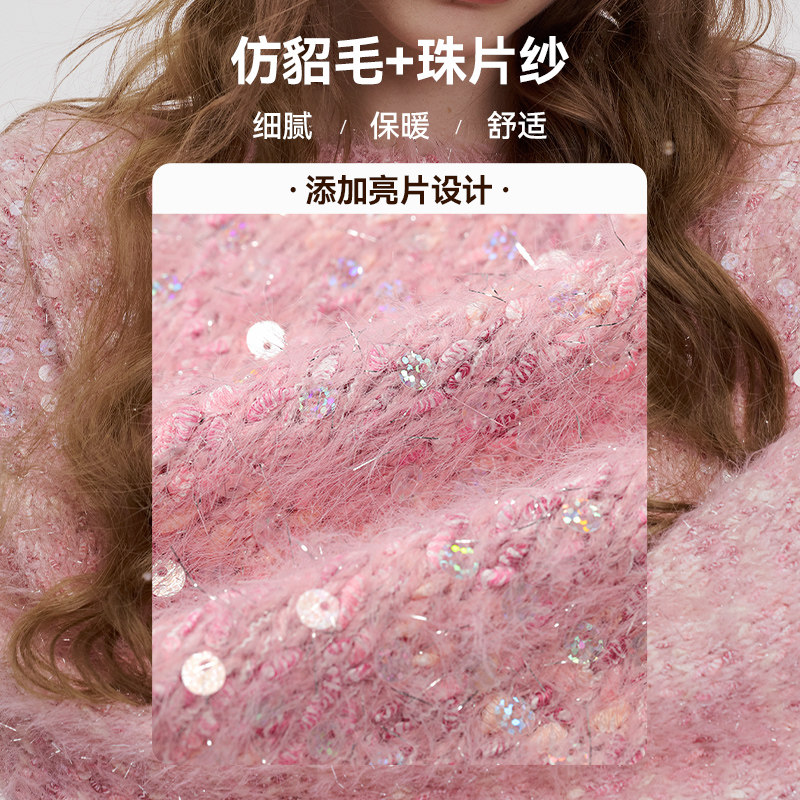 妖精的口袋粉色亮片宽松甜美毛衣女2025年冬季新款仿貂毛新年穿搭