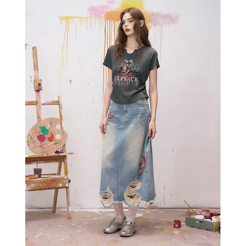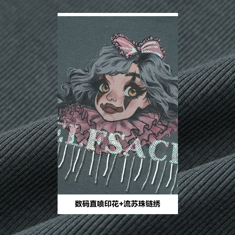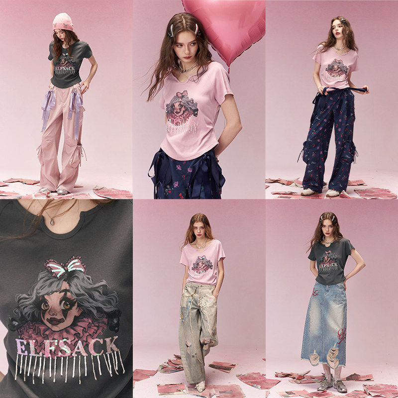 妖精的口袋灰色印花流苏短袖t恤女2026年早春新款修身设计感上衣