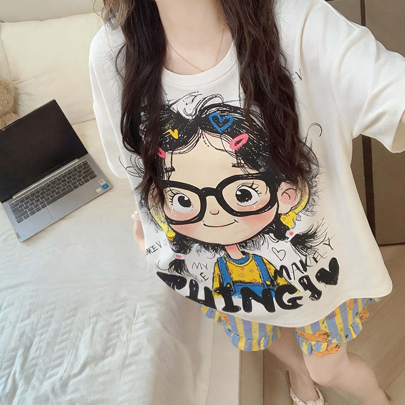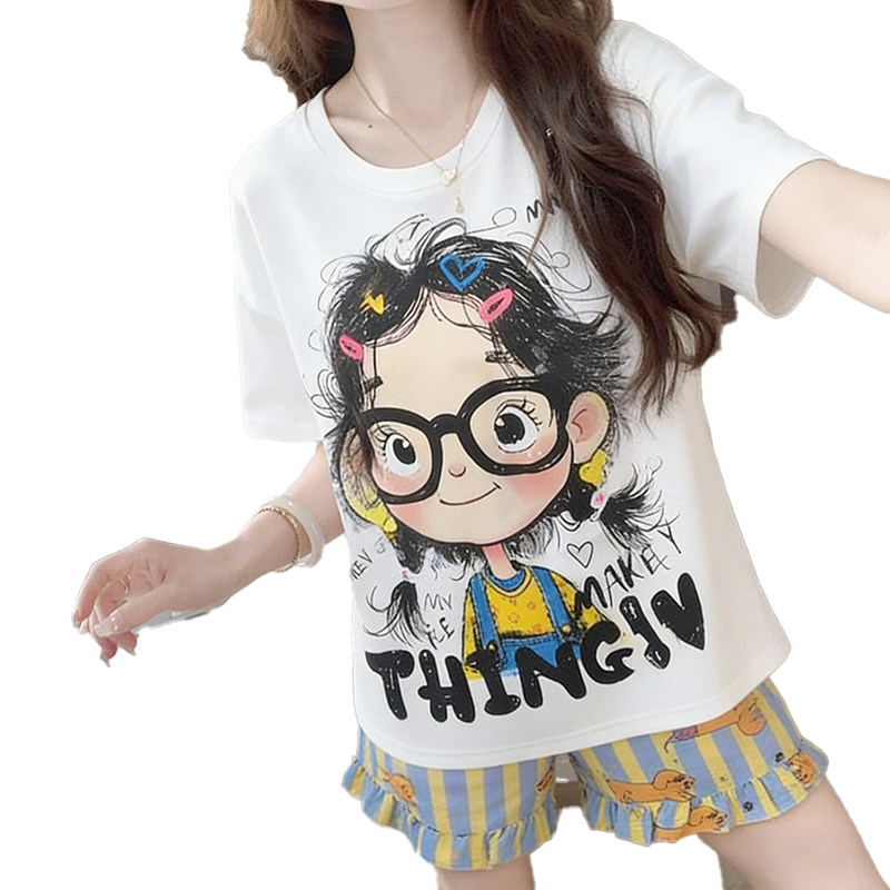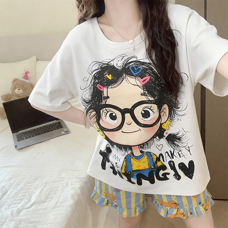 带胸垫睡衣女款2026新款夏季短袖卡通卷毛女孩薄款大码家居服套装