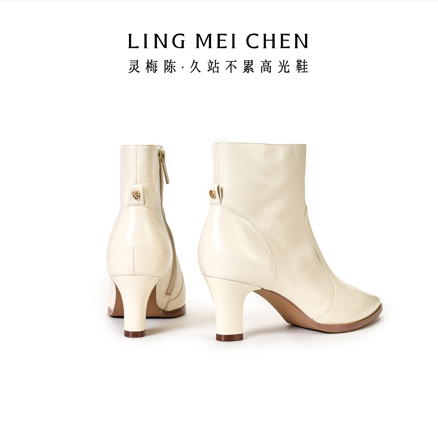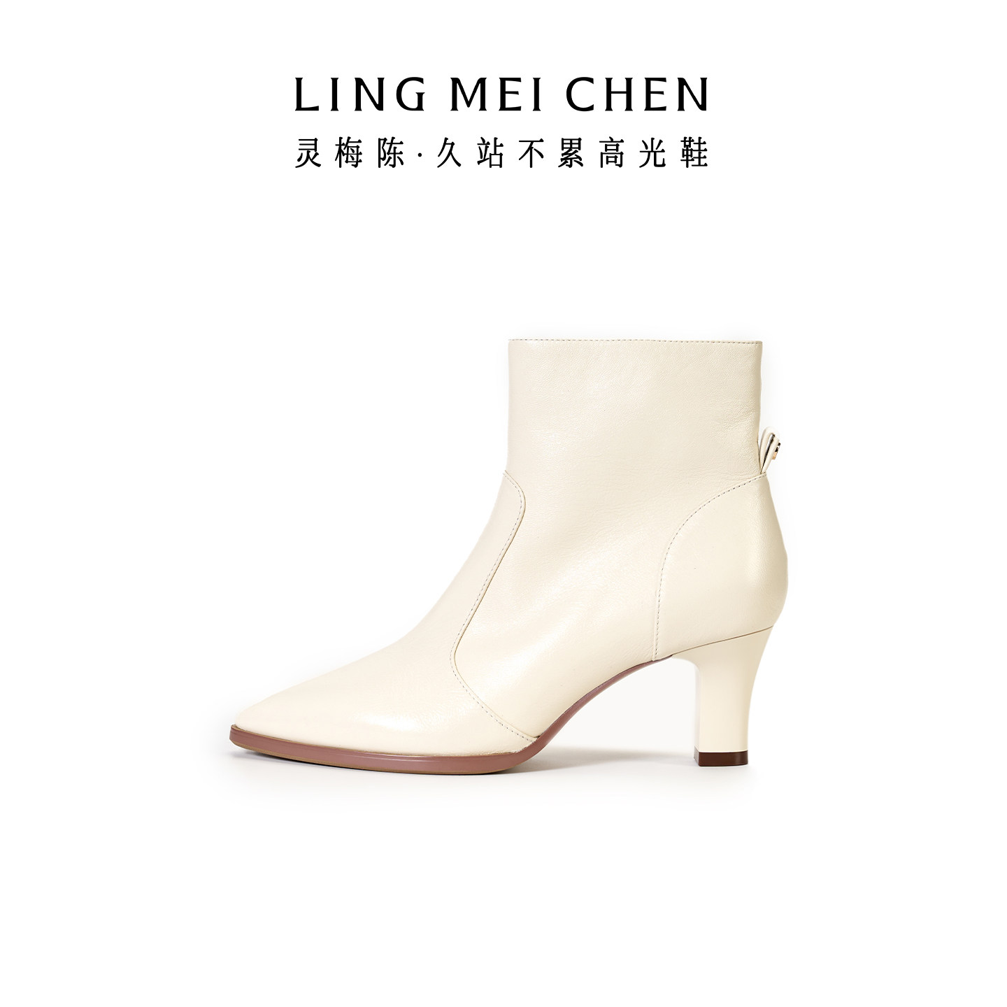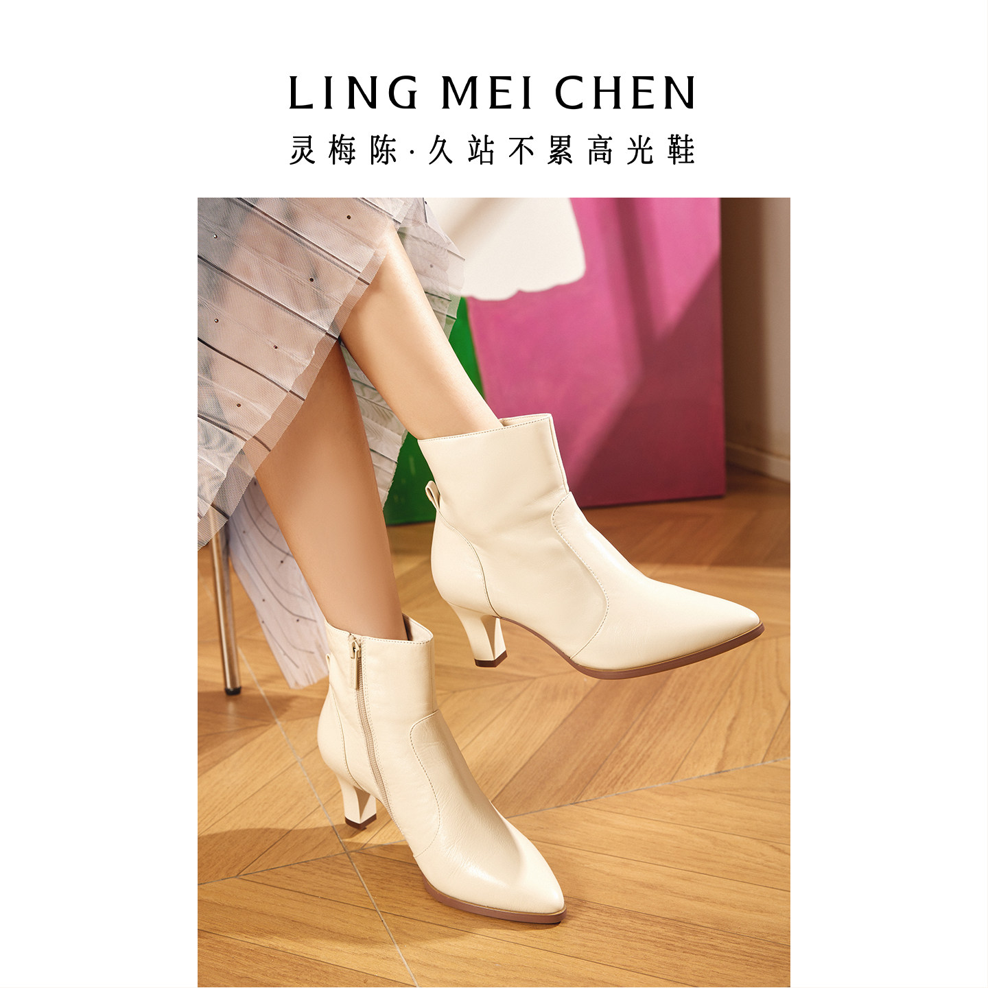 LINGMEICHEN白色短靴尖头粗跟羊皮加绒靴新款女士皮鞋冬季高跟鞋
