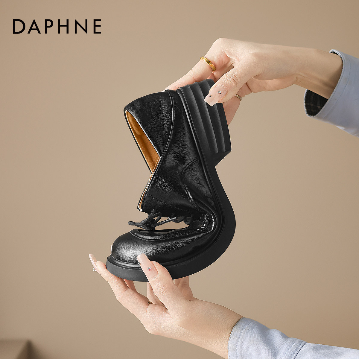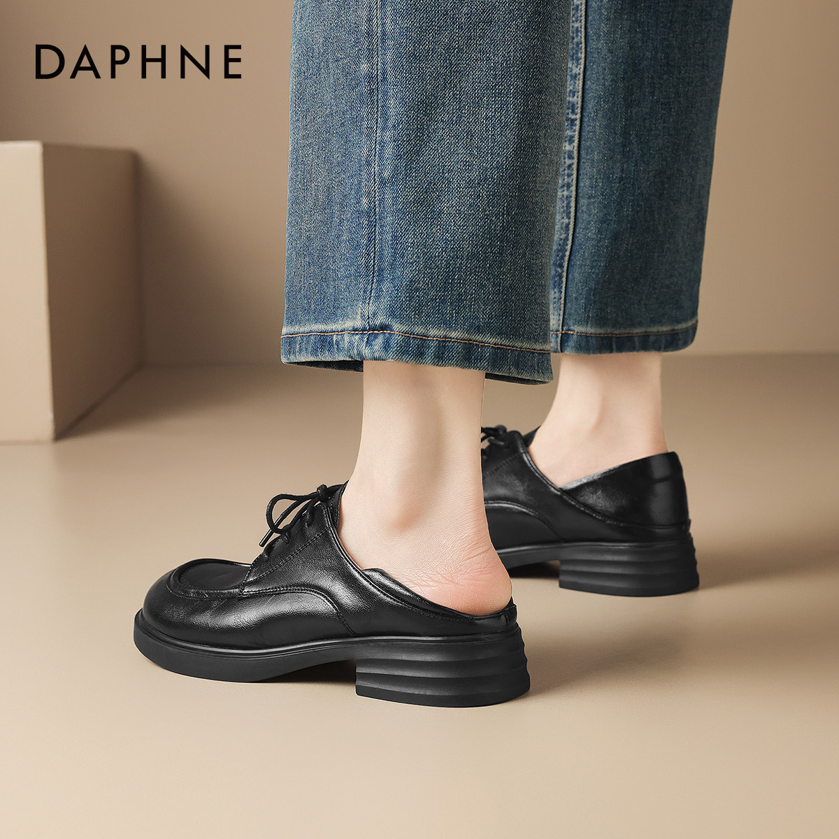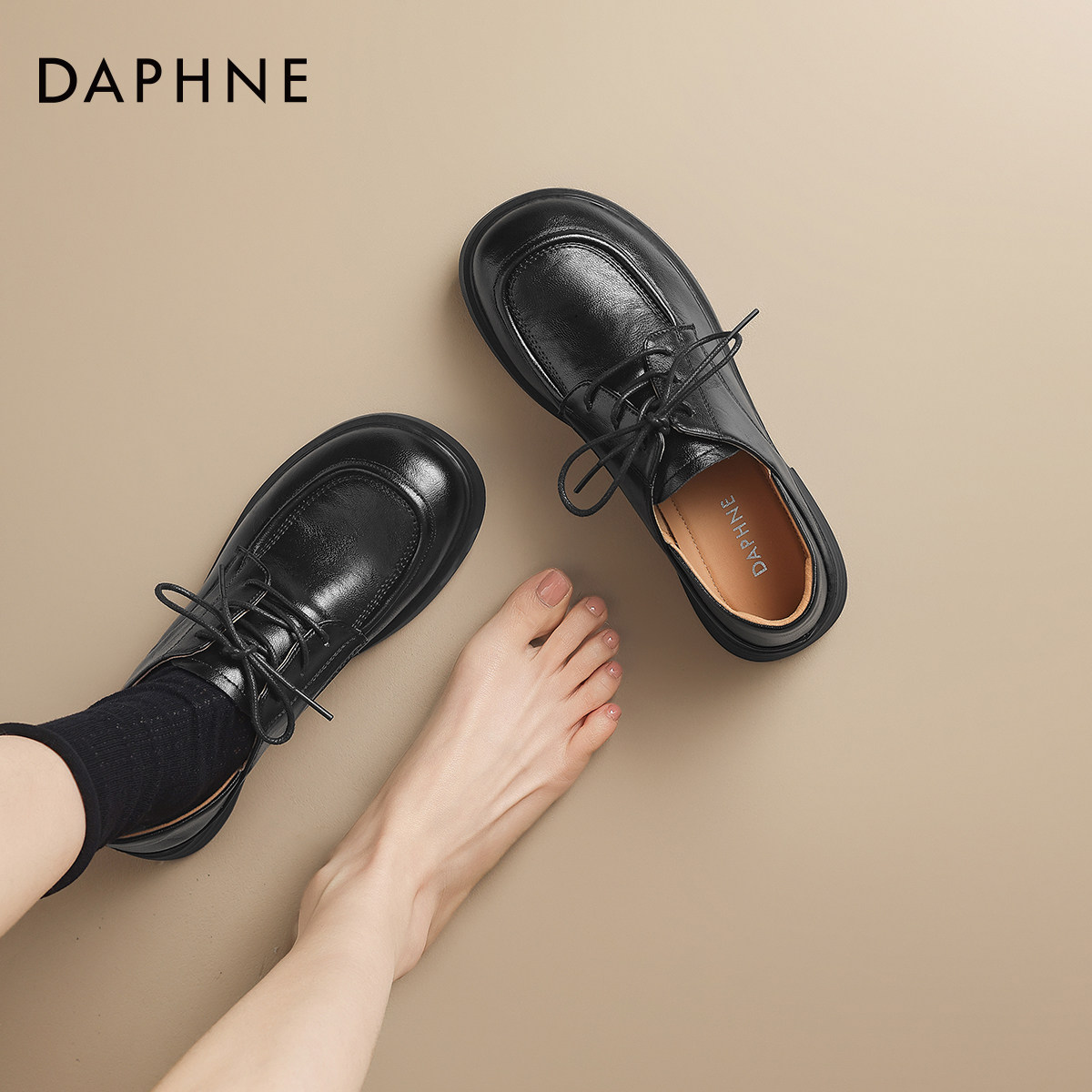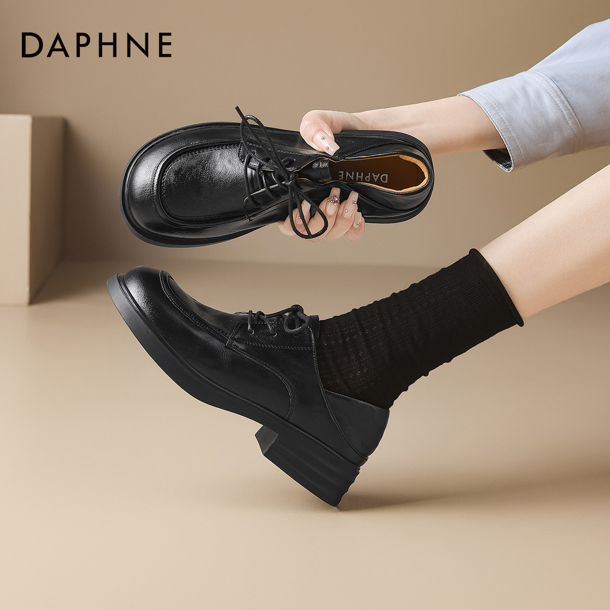 达芙妮乐福鞋女款粗跟2026新款春季英伦黑色系带小皮鞋布洛克单鞋
