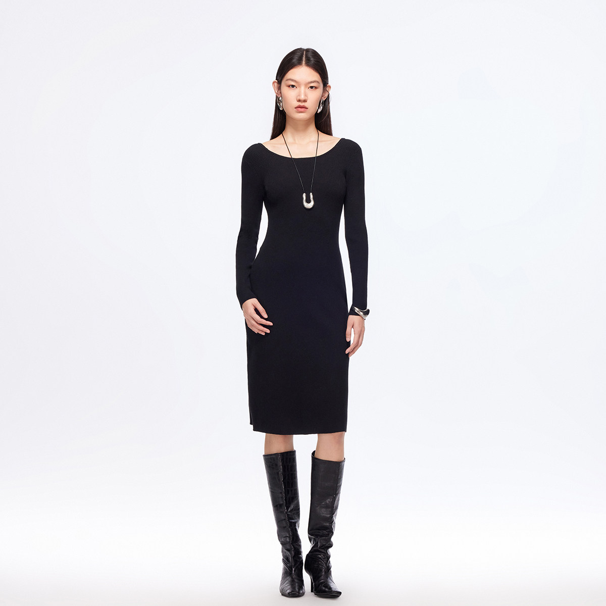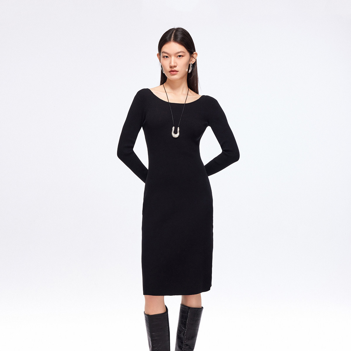 COCOBELLA简约气质黑色收腰极简风连衣裙女优雅短袖长裙FR3033-2