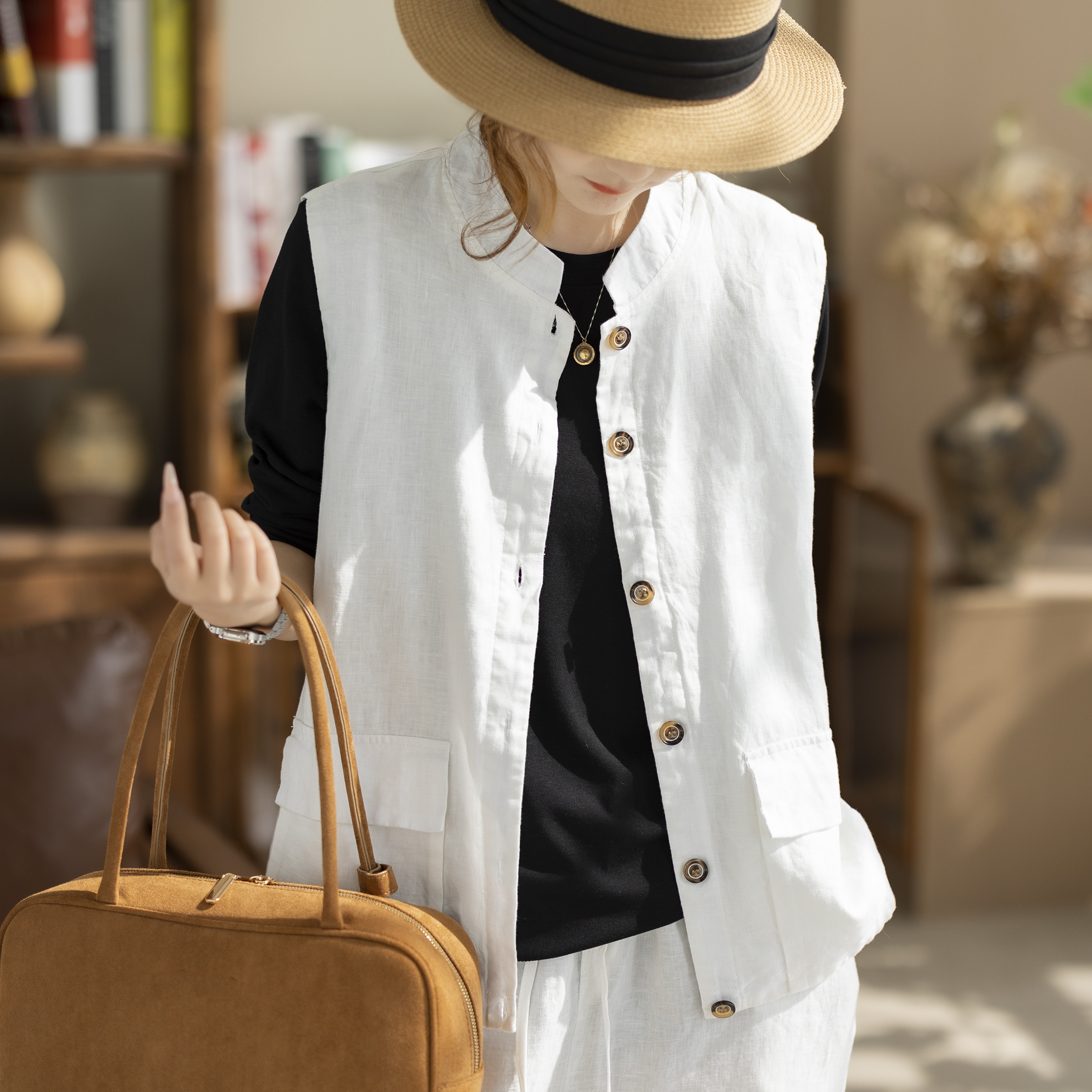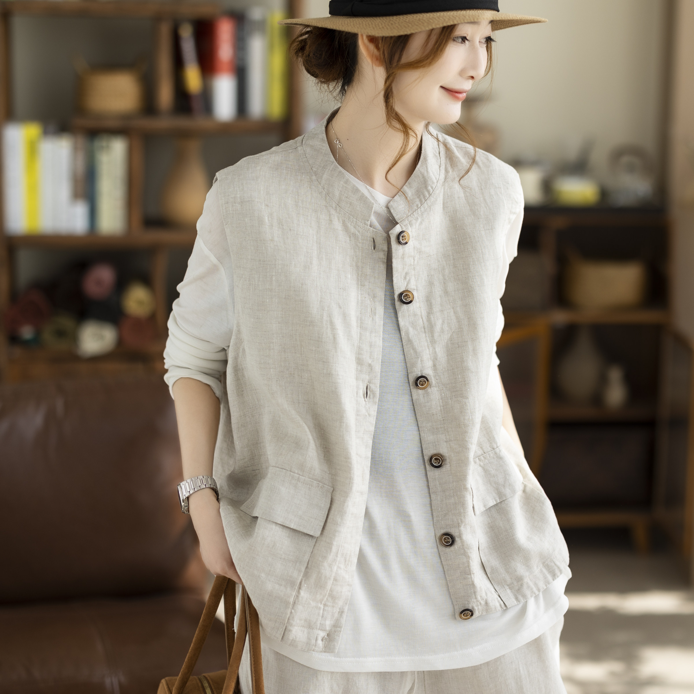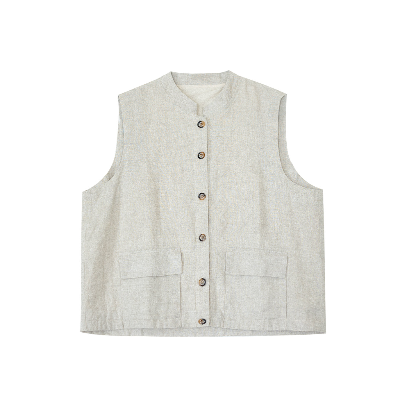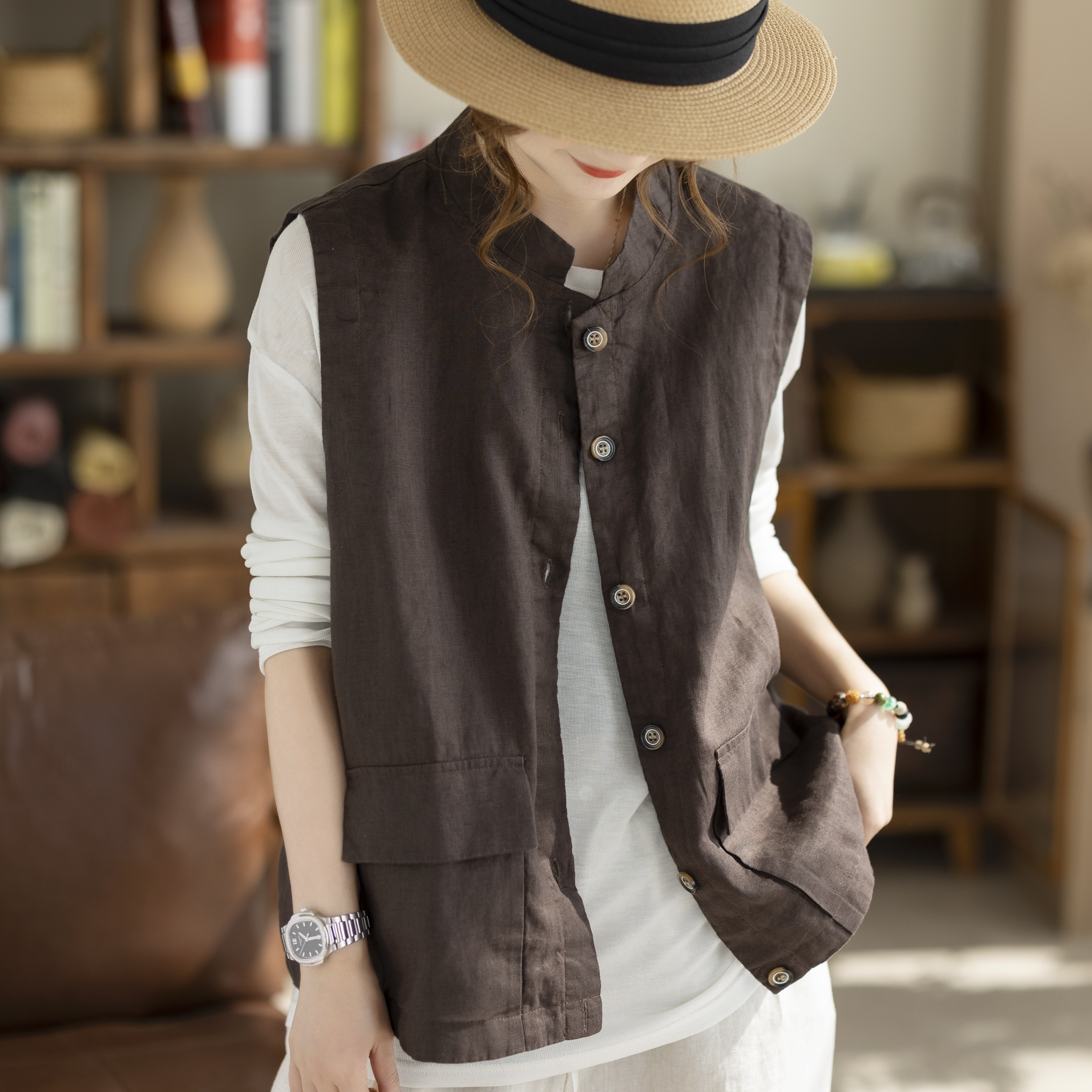 咖咪羽纯亚麻立领马甲复古工装风宽松短款坎肩双口袋休闲百搭外套