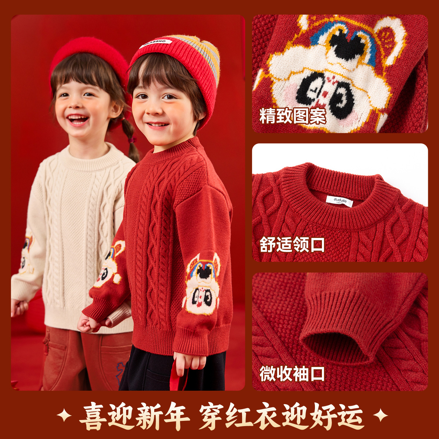 嘟嘟家男童拜年服冬季毛衣红色宝宝新年装女童毛线衣唐装上衣儿童