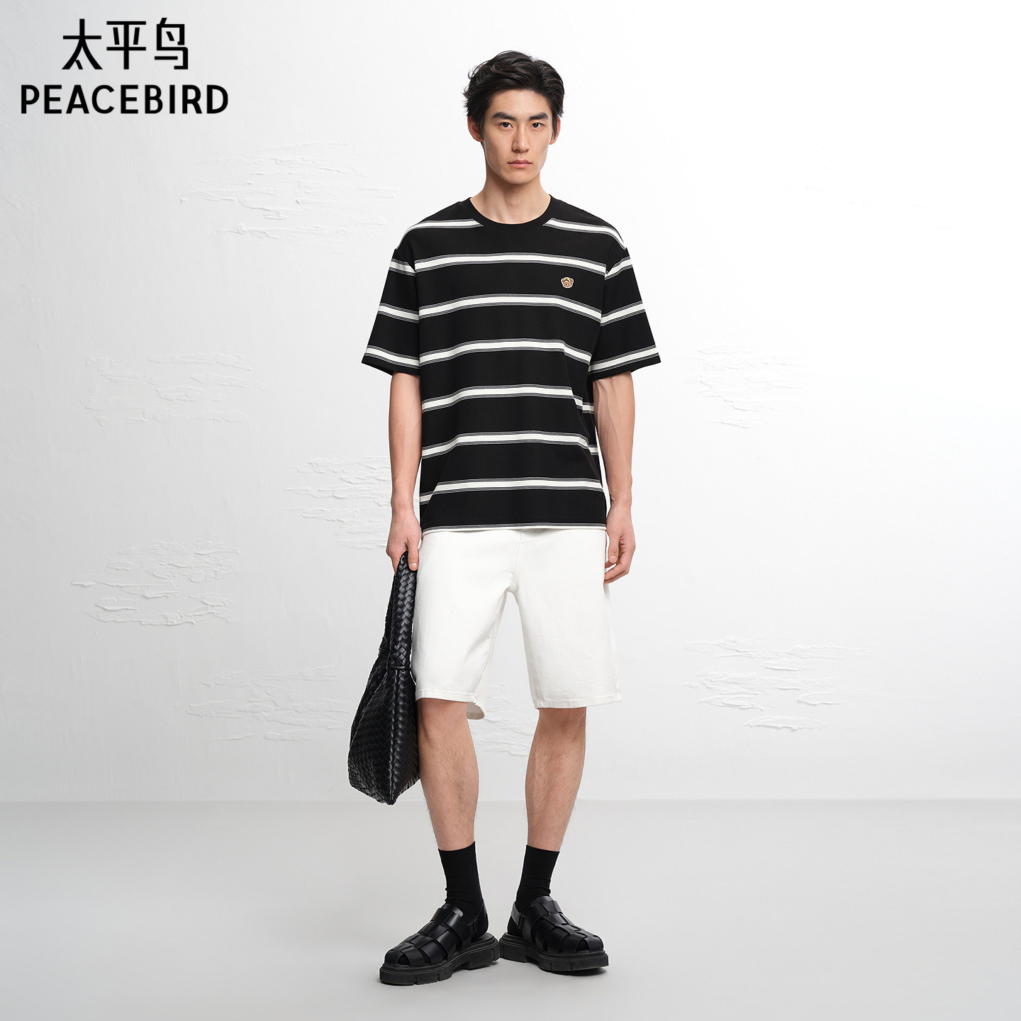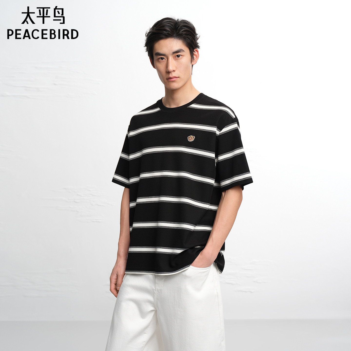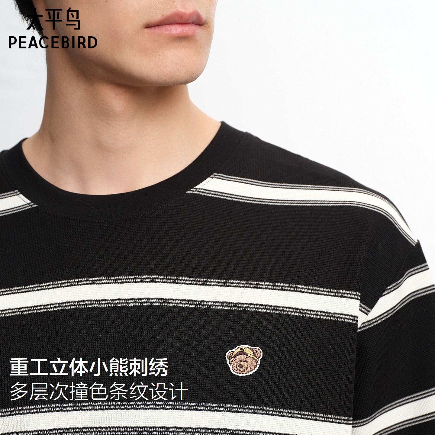 太平鸟男装时尚撞色条纹短袖T恤2026夏新款小熊刺绣情侣重磅体恤