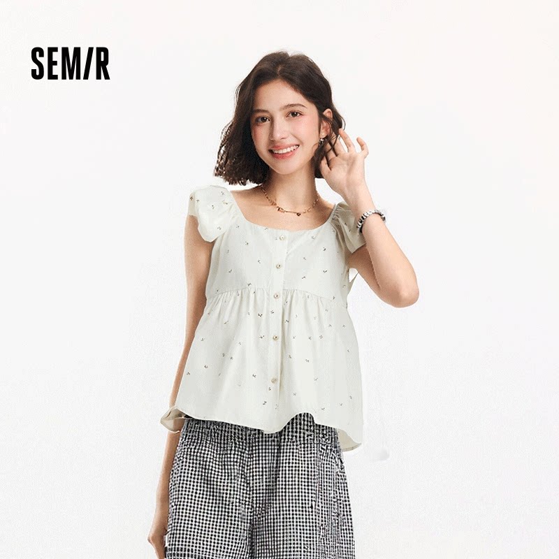 [商场同款]森马短袖衬衫女短款方领泡泡袖2025新款夏季碎花娃娃衫