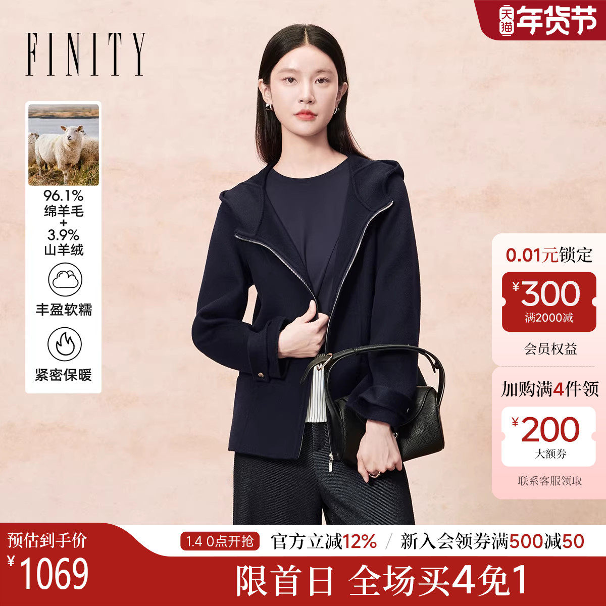 【羊绒】FINITY菲妮迪毛呢外套2025年冬季新款简约双面呢大衣女
