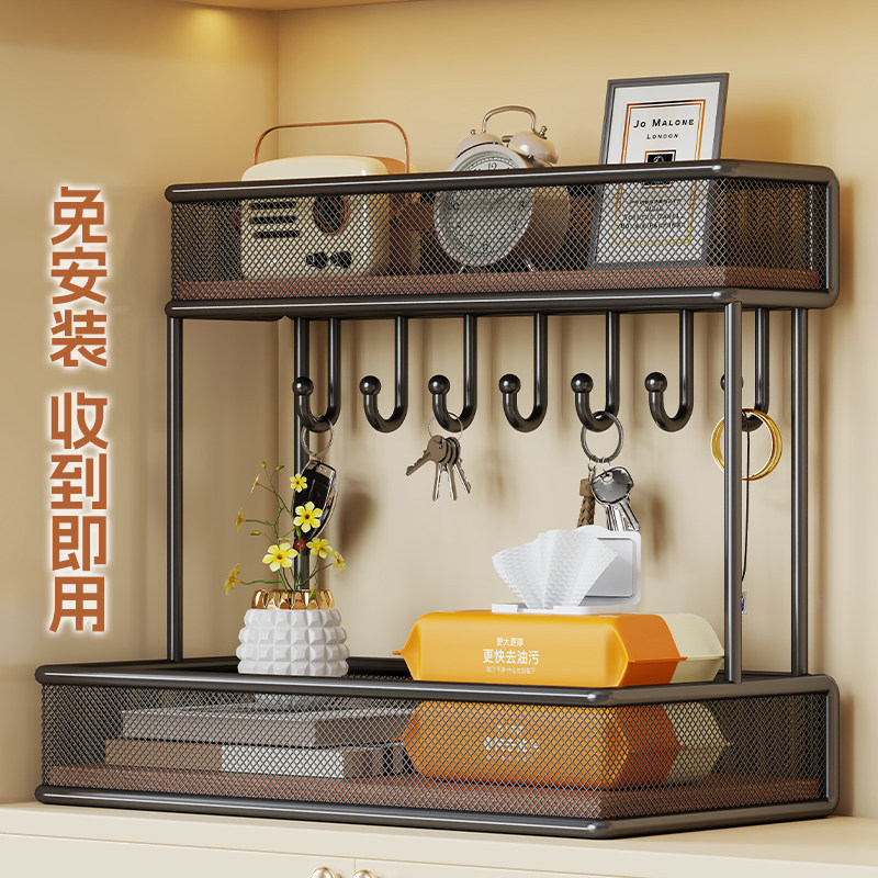 钥匙收纳盒装饰摆件饰品入户玄关家用双层带挂钩多功能铁艺置物架