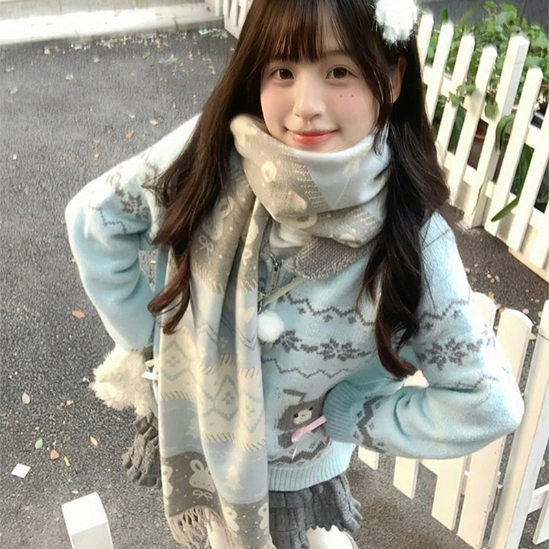 雪花双面针织围巾女秋冬季韩系氛围感加厚保暖高级感围脖复古披肩