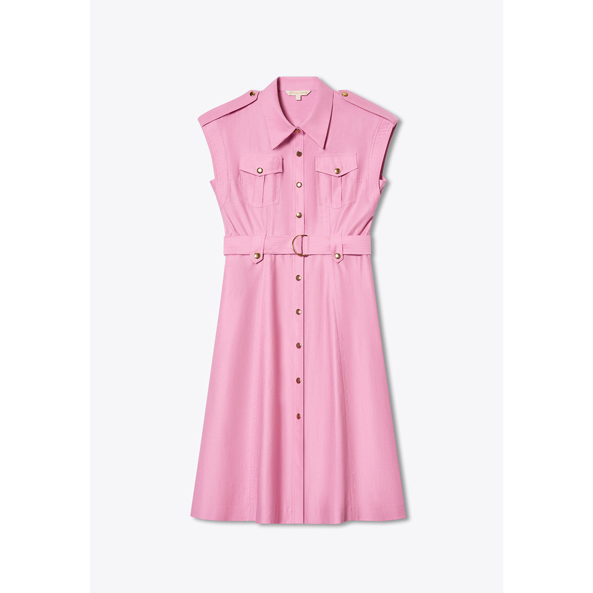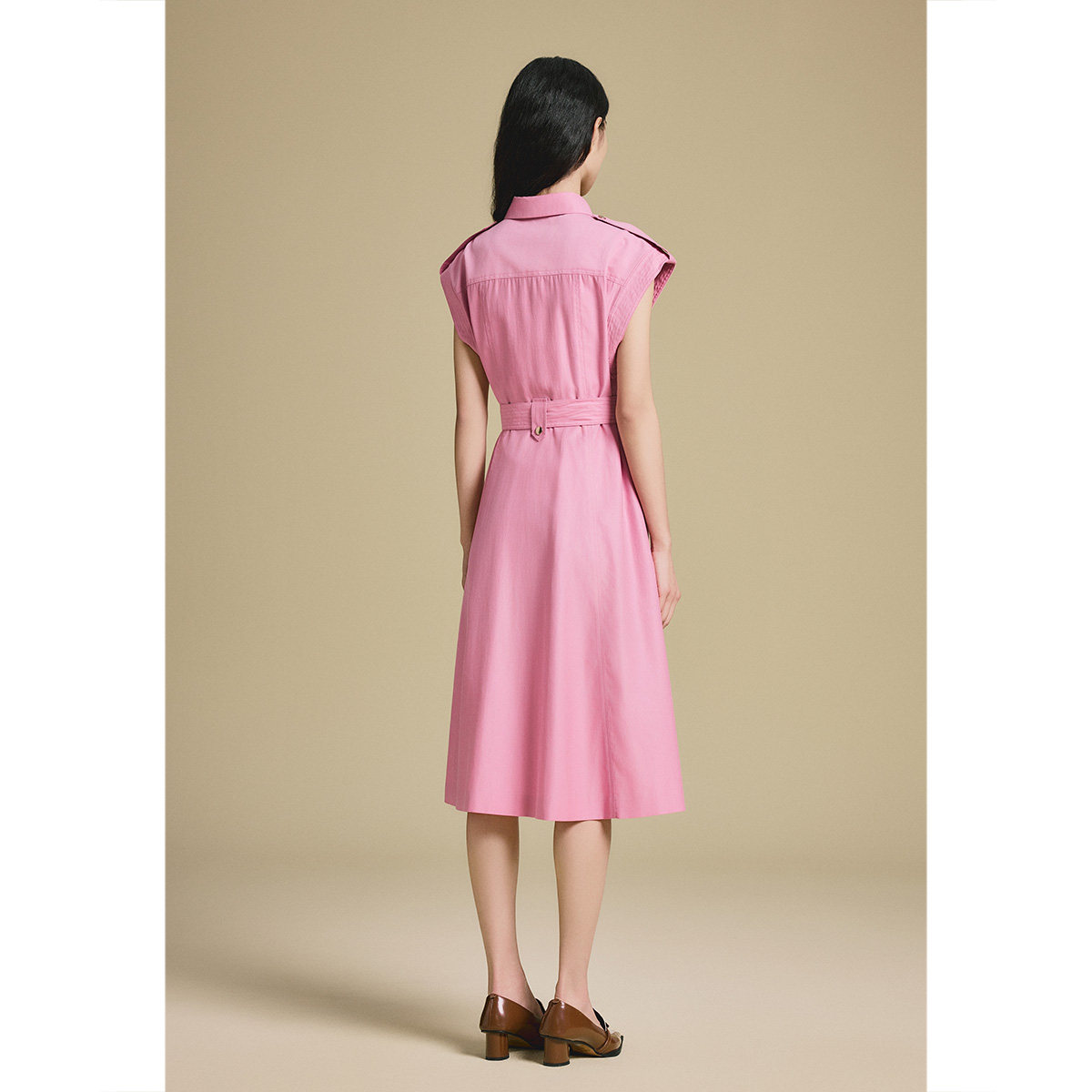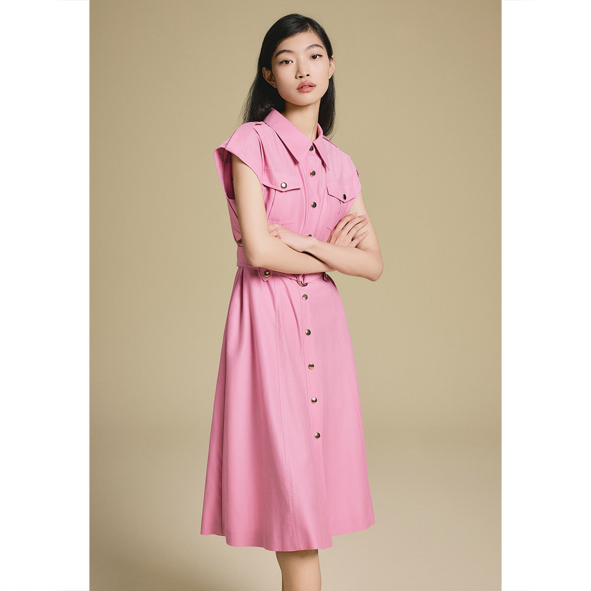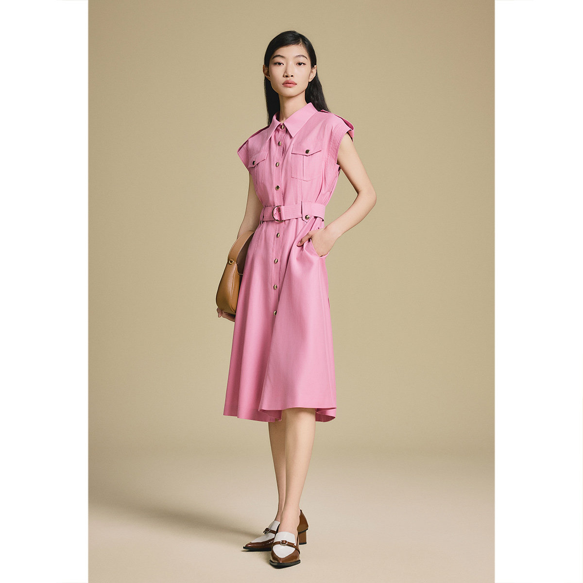 诗篇专选天丝混纺金属扣翻领系带收腰显瘦无袖连衣裙2025夏季新款