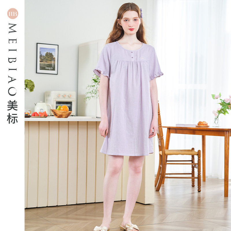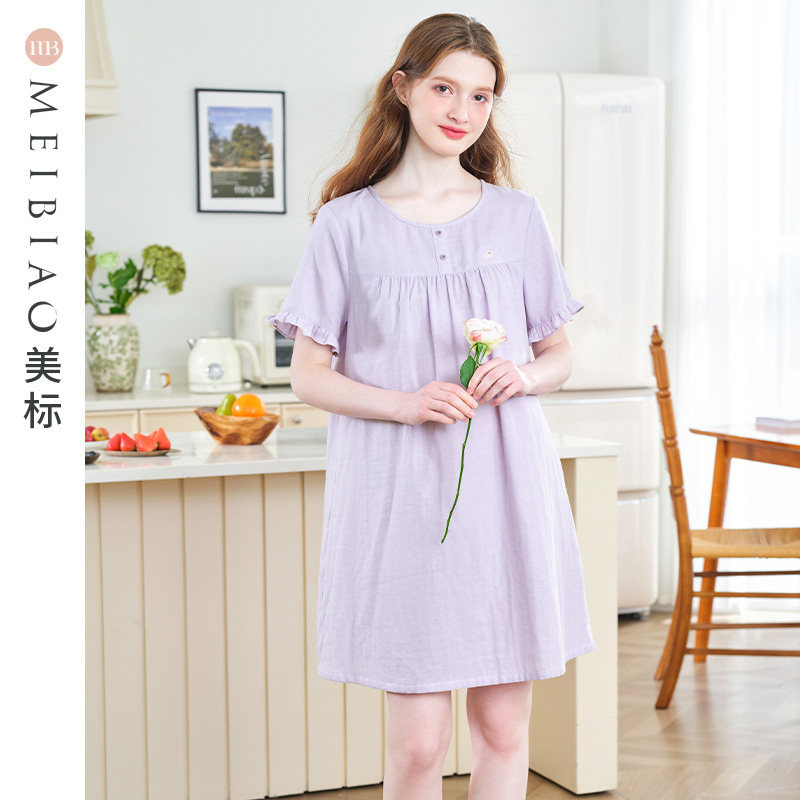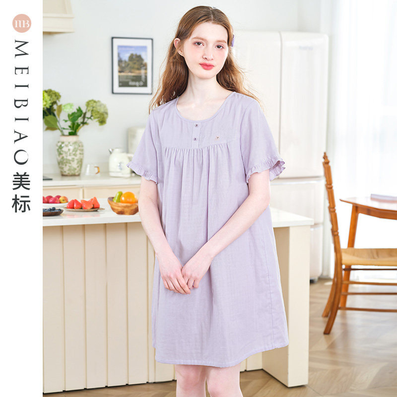 美标新款纯棉睡裙女夏薄款双层棉纱全棉可外穿睡衣文艺复古家居服