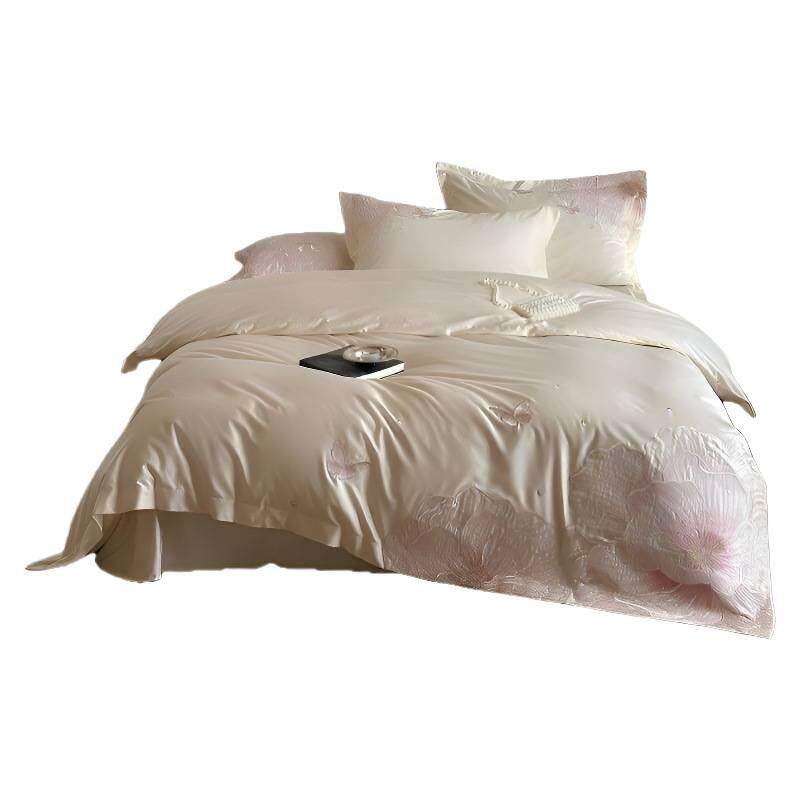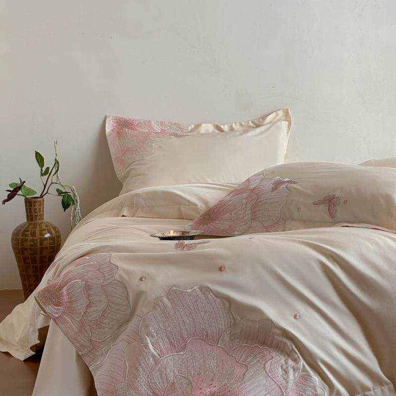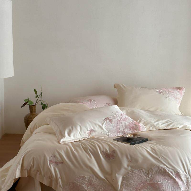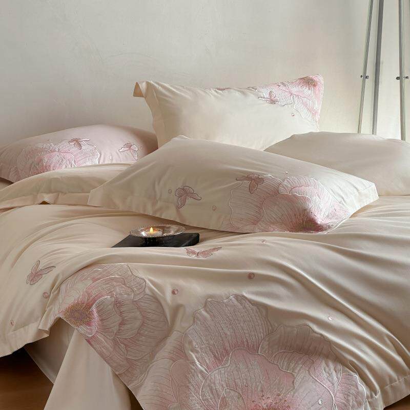 轻奢A类加厚全棉贡缎长绒棉四件套宽边刺绣被套床单1.8m纯棉床笠