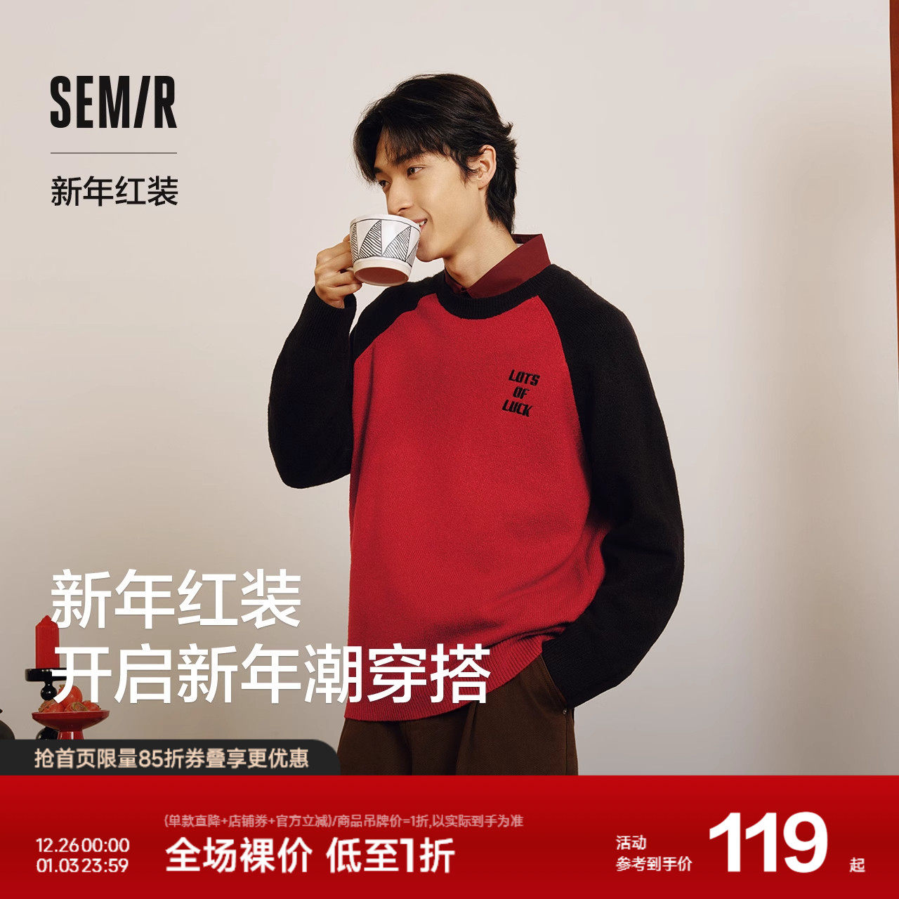 森马毛衫男春季红色毛衣打底纯色提花针织衫宽松套头上衣时髦潮流