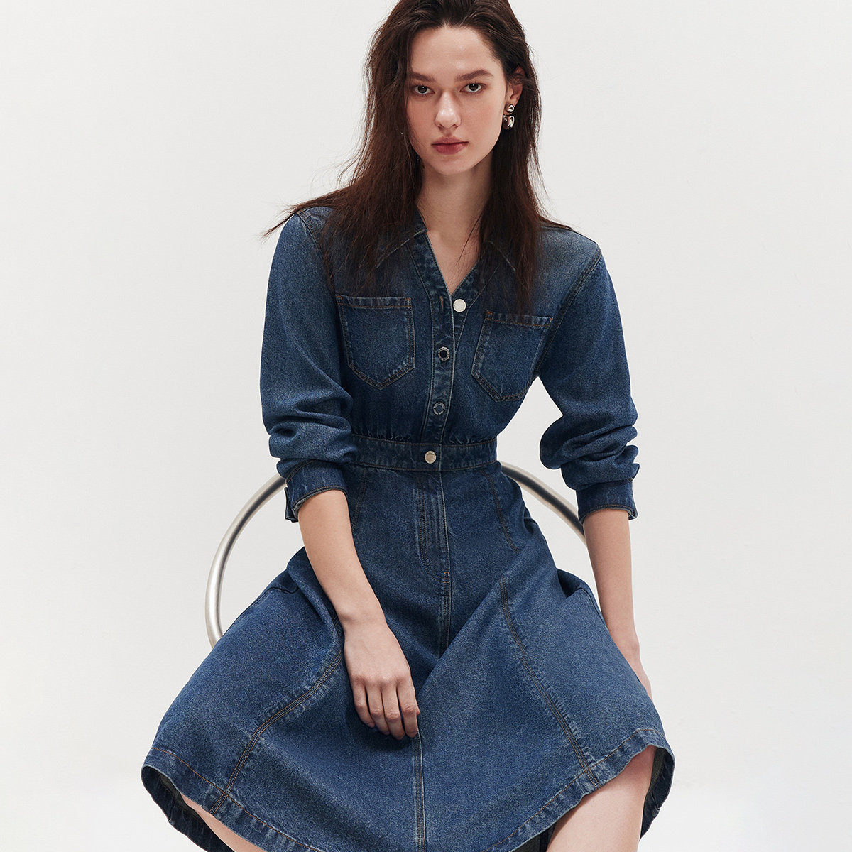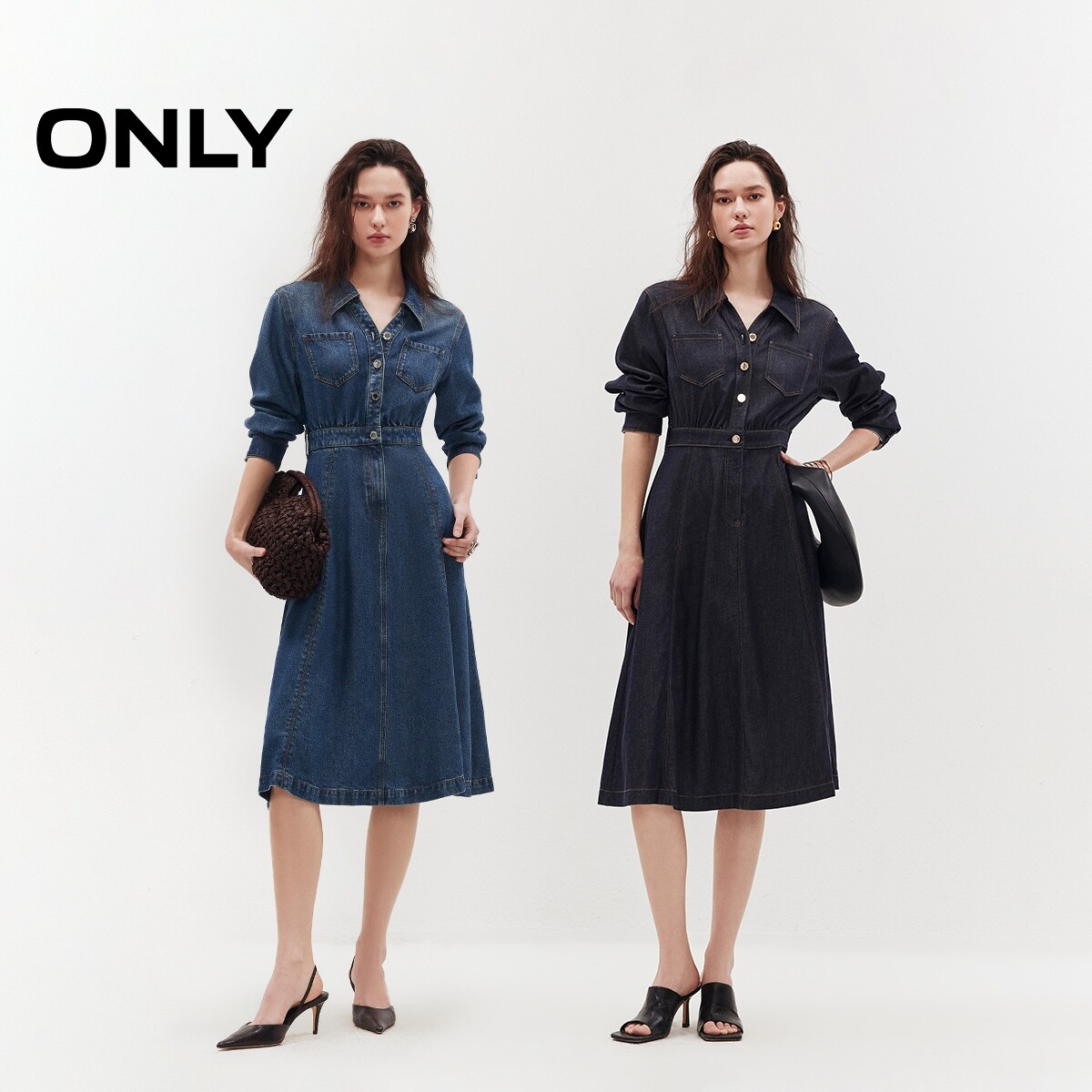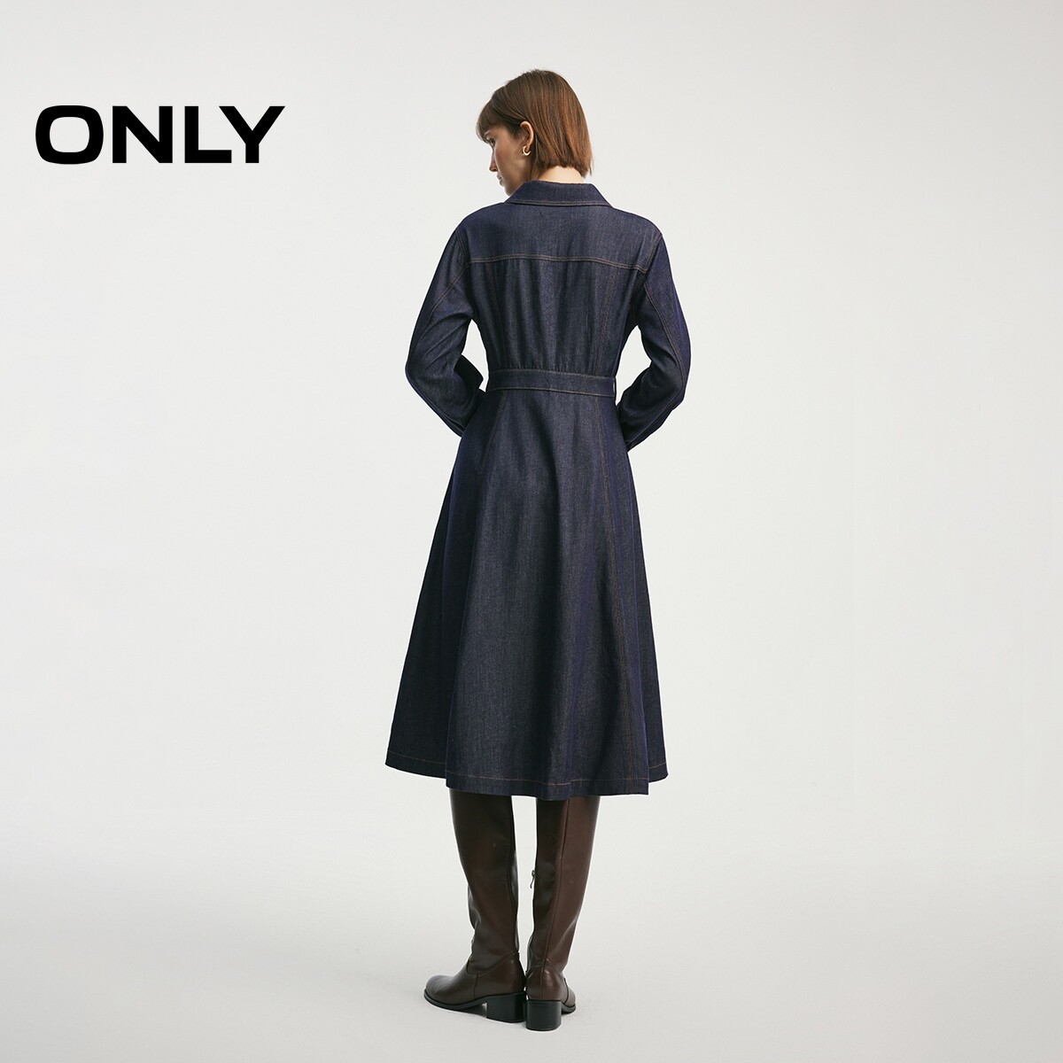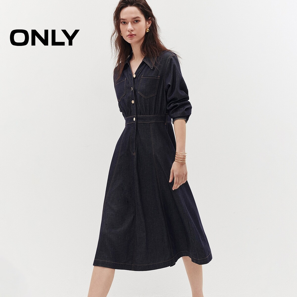 ONLY2026春季新款莱赛尔柔软衬衫领明线A字伞形裙子牛仔连衣裙女