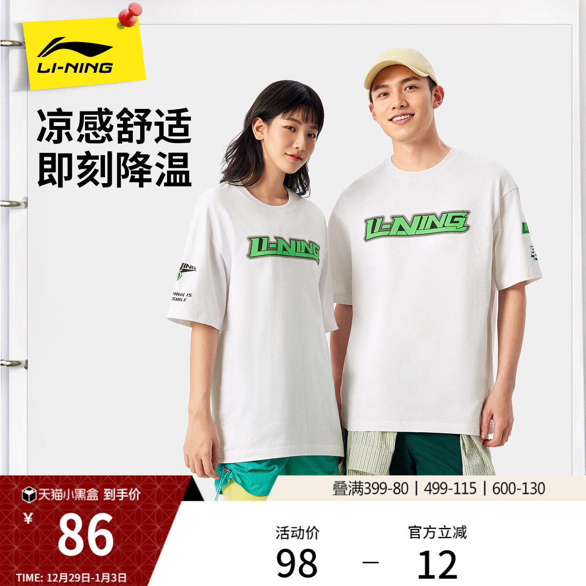 李宁短袖男士夏季官方新款情侣款冰丝半袖休闲上衣印花运动T恤女